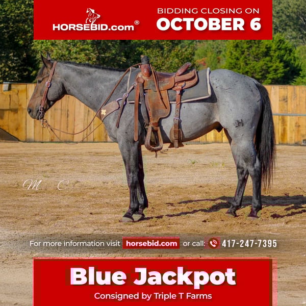 🍂 𝓐𝓾𝓽𝓾𝓶𝓷 𝑨𝑳𝑳 𝑺𝑻𝑨𝑹 𝑳𝑰𝑵𝑬𝑼𝑷 🍂 Happening now thru MONDAY | OCTOBER 6th - Available EXCLUSIVELY on HorseBid's website! For more details and to register visit: www.Horsebid.com CONSIGNOR CONTACT: Triple T Farms 417-247-7395 LOCATION: Summersville, MO BREED: Quarter Horse REGISTERED: Yes REGISTERED NAME: Heirs Blue Cowboy COLOR: Blue Roan HEIGHT: 15.3 AGE: 6 GENDER: Gelding Blue Jackpot is standing at 15.3 hands and is as gentle as they come. He’s the first to greet you in the field and follows you around like a puppy. He’s a favorite around the farm, especially with my kids. My son loves weaving between his legs and riding him in the pen. My 3-year-old enjoys leading him around the barn, and my 11-year-old nephew takes him for strolls down the road without a hitch. Blue Jackpot is a hard worker, too! He spent all winter working daily in the sale barn, pushing cows and moving livestock—all with ease. On weekends, he’s been learning roping and is making fantastic progress on the roping dummy and a few live cows. But he’s not just about work; he’s a trail rider's dream. He’s brave and never backs down from any challenge you put in front of him. Whether he’s leading the way or following along, he matches the group’s pace perfectly. He’s been trail ridden across Arkansas, Kansas, and Missouri, so he’s ready for all kinds of terrain. He has even taken a trip to Texas hog hunting and absolutely excelled at that as well. Blue Jackpot will be a wonderful addition to anyone’s team—whether it's for ranch work, roping, or as a smooth and reliable trail partner. He has a calm demeanor that makes him perfect for riders. His friendly nature and good looks will surely win your heart! Come meet Blue Jackpot for yourself and take home this gorgeous blue roan—he’s ready to be your new best friend!
