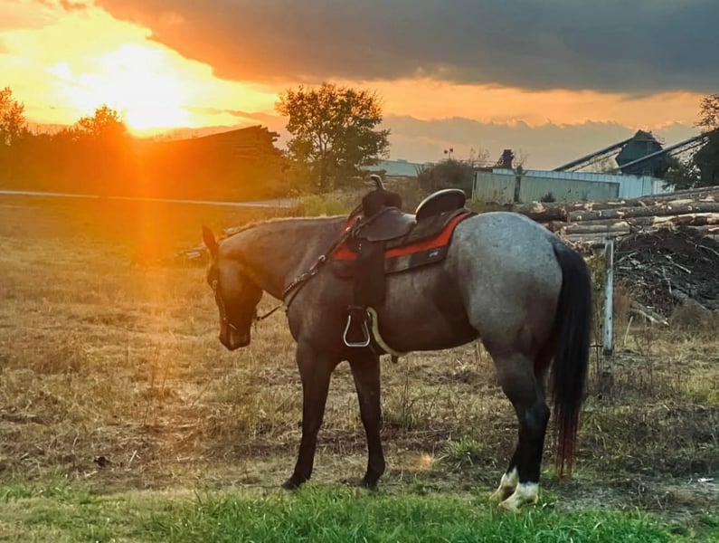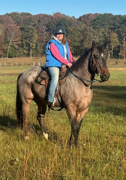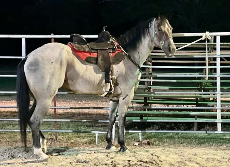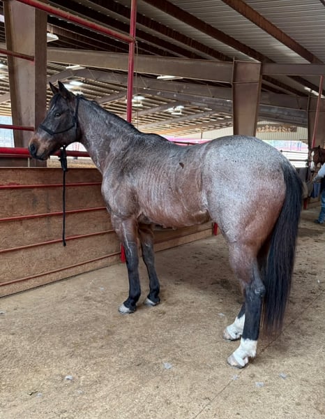 "AVAILABLE ON ONLINE HORSE AUCTION AT www DOT PlatinumEquineAuction DOT com BIDDING OPEN NOW thru SUNDAY | APRIL 12TH! *Final price will be determined on auction site* CONSIGNOR CONTACT INFO: Route 31 Equine 479-234-6514 LOCATION: Hatfield, AR Poco – 2019 AQHA Registered Roan Gelding Big 16H Ranch Horse Deluxe | Fancy Broke | Head Horse Prospect If you’re looking for a big, good-looking ranch gelding with size, substance, and an exceptional handle, Poco is one that deserves your attention. Standing approximately 16 hands and weighing approximately 1,400 pounds, Poco is a powerful, square-made gelding with excellent conformation and the kind of presence that turns heads wherever he goes. Poco is the definition of a ranch horse deluxe. He has been used for ranch work, gathering cattle, and is started on the head side, where he has been tracking and pushing cattle. With his size, strength, and natural ability, he shows great promise as someone’s number one head horse. At the same time, if you simply need a reliable ranch partner to check fences, doctor cattle, or cover big country, Poco is ready to go to work. Under saddle, Poco is very fancy broke and extremely enjoyable to ride. He carries a smooth rocking-chair lope and a steady, easy trot you can sit all day long. He lopes correct circles both directions and takes the correct leads with ease. He has an excellent stop, is soft in the bridle, and neck reins beautifully — lay the rein over his neck with one hand and off you go. He will side pass, counter-arc, and move off your leg, showing the kind of training and responsiveness that makes him a pleasure to ride. Outside the arena, Poco is confident and seasoned. He has been ridden everywhere from ranch work and cattle gatherings to barrel races, rodeos, and even down the highway and through town. He is not a spooky horse, handles new environments well, and will cross brush, rough terrain, and obstacles without hesitation. Poco travels exactly the speed you ask for — walk if you say walk, lope if you say lope. He is not a run-off and not a deadhead, making him enjoyable for long days in the saddle. On the ground, Poco is easy to handle and enjoyable to be around. He has a goofy, friendly gelding personality, is easy to catch wherever you find him, stands quietly tied, loads and unloads well, and is excellent for the farrier with good, hard black feet. He is also easy to bathe and stands quietly to be hosed off. Poco rides well alone or in a group, has a nice neck rein, and will open and close gates with ease. He is traffic safe, unfazed by dogs and wildlife, and stands patiently for mounting. He does well in a stall or turned out in the pasture, pastures well with other horses, and is an extremely easy keeper. Poco travels sound with no maintenance and sells 100% sound and ready to go to work. He comes with a current Coggins, and pre-purchase exams are welcome at the buyer’s expense. Poco is located in Hatfield, Arkansas. He is best suited for a confident rider that. He does best with consistent riding. Big, stout geldings with this kind of size, training, and versatility are becoming harder and harder to find. Whether you’re looking for a head horse prospect, dependable ranch partner, or a big comfortable trail horse, Poco is ready to go to work for you. For more information contact Jalene with Route 31 Equine at 479-234-6514.