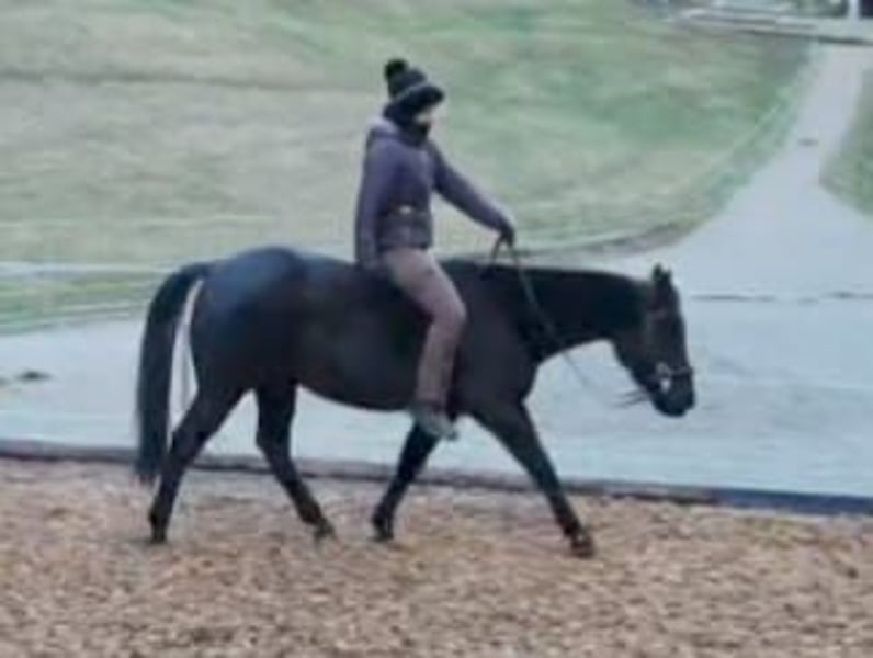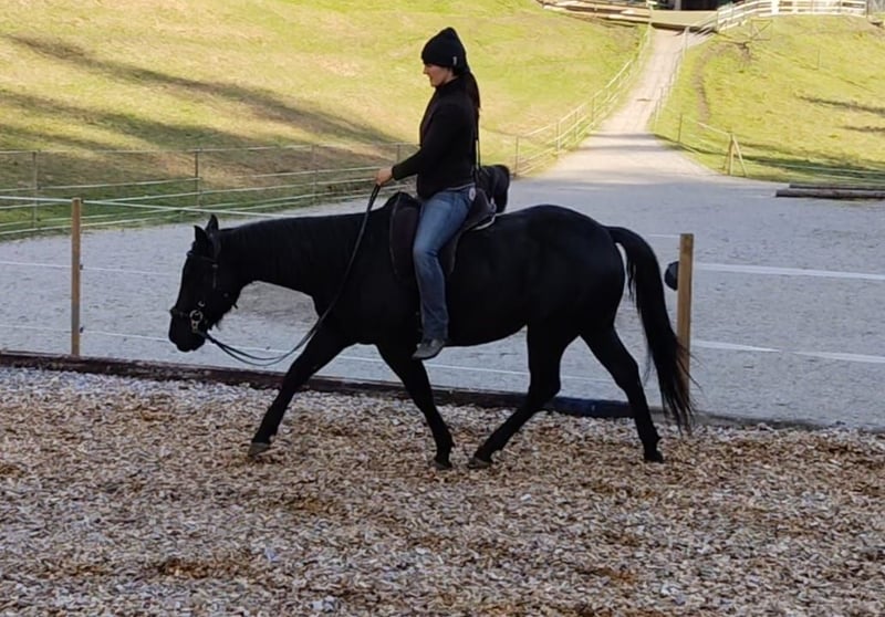 Quarter Horse Wallach, AQHA Papier, 8 Jahre alt, Rappe ohne Abzeichen, ca. 1,44 groß, barhuf, gesund, natürlich regelmäßig geimpft, entwurmt und Zähne gemacht, sehr gepflegt, sehr brav und gut ausgebildet! Gute Westernausbildung, ein- und beidhändig geritten, geht auch perfekt mit jeder gebisslosen Zäumung! Am Platz und im Gelände auch nur mit Halsring und ohne Sattel absolut brav. Mit Trainer an der Hand (!) durchaus auch für Kinder oder ungeübtere Reiter geeignet, auch um Reitabzeichen zu machen oder erste Turniererfahrung zu sammeln! Ist auch mit kleinen Kindern total lieb, unser 3 jähriger sitzt auch schon drauf. Er ist eher der gemütliche Typ beim Reiten, reagiert aber trotzdem auch fein auf leichteste Hilfen. Er hat mit weiterem Training auf jeden Fall Potential als Turnierpferd für Reining, Trail, Ranch Klassen,... Richtung Reining wurde er bereits trainiert, verschiedene Trailhindernisse macht er auch schon gut. Auch einzelne "Sprünge" bis 60cm kennt er. Bodenarbeit macht ihm sehr Spaß, er kennt auch Freiarbeit und ein paar Zirkuslektionen/Tricks wie Spanischen Schritt, Kompliment, Beine kreuzen, Ball spielen, Target Training, freies Longieren, rückwärts auf einen zugehen, Podest, Wippe, Dinge ins Maul nehmen und halten, ... Im Gelände ist er auch spitze, auch nach 3 Wochen Reitpause kann man ihn schnappen und ohne Sattel nur mit Halfter eine Runde drehen, egal ob alleine oder in der Gruppe! Er kennt es auch ein Handpferd neben sich laufen zu haben oder selber als Handpferd zu gehen. Brav beim Schmied, Tierarzt, im täglichen Umgang, beim Verladen und Fahren,... Er hat keinerlei Unarten! Steht bei mir im gepflegten Offenstall in gemischter Herde! Er kennt so ziemlich alle Bauernhoftiere die es gibt, wir haben viele verschiedene Tiere am Hof - ist ihm alles egal. Auch Kinderlärm, Traktoren, Schüsse,... bringen ihn nicht aus der Fassung. Der brave Bub kann gerne jederzeit kennen gelernt werden - ich suche für ihn einen wirklich guten Platz, bevorzugt bei liebevollen Freizeitreitern! Er geht vermutlich demnächst in einen Trainingsstall, weil mein Reitplatz im Winter gefroren ist und Probe reiten dann nur eingeschränkt möglich ist - bei weiterer Ausbildung steigt der Preis. Wird nur wegen Umstieg auf Islandpferde verkauft, kein Notverkauf, keine Ratenzahlung oder zur Verfügung stellen! Bei Bestplatz ist der Preis noch leicht verhandelbar! Weitere Fotos vom Pferd ohne Reiter folgen, Videos gerne auf Anfrage! Transport innerhalb Österreichs gerne wirklich günstig möglich! Für Freizeitreiter vielleicht interessant: gerne kann ein vor allem beim Ausreiten extrem bequemer Barefoot Atlanta Sattel mit Lammfellsitz und allem benötigten Sattelzubehör und ein Zaumzeug günstig mitgekauft werden!