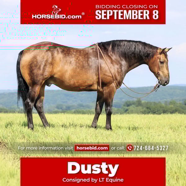 ♦️ 𝐭𝐡𝐞 𝐒𝐞𝐩𝐭𝐞𝐦𝐛𝐞𝐫 𝑺𝒆𝒍𝒆𝒄𝒕 ♦️ Happening now thru MONDAY | SEPTEMBER 8th - Available EXCLUSIVELY on HorseBid's website! For more details and to register visit: www.Horsebid.com CONSIGNOR CONTACT: LT Equine 724-664-5327 LOCATION: Miola, PA BREED: Grade REGISTERED: No COLOR: Dapple Buckskin HEIGHT: 14.3 AGE: 8 GENDER: Gelding Introducing Dusty, a gorgeous dapple buckskin gelding that stands approximately 14.3 hands tall and is thick built and very friendly. Dusty is the kind of trail horse you love to have in your barn as your main trail horse or spare horse for all your friends to ride. He follows along or goes out alone! He is a been there done that trail horse for any level rider. Dusty has great ground manners and a puppy dog personality. He’s smart and takes to obstacles with ease and willingness. He has a smart head on his shoulders and kind personality. Dusty would also make a great kids horse. Dusty will also arena ride, walk trot and lope picking up both leads. He neck reins, stops and backs up with ease. He’ll stand at the mounting block, stand tied regularly or in cross ties, he baths quietly picks up all four feet with ease. Is great for the farrier and the vet. is good in turn out, or in a stall. He has no vices and is current on his coggins and vaccinations. Check out his video and if you have any questions about Dusty give me a call or text! Thank you!