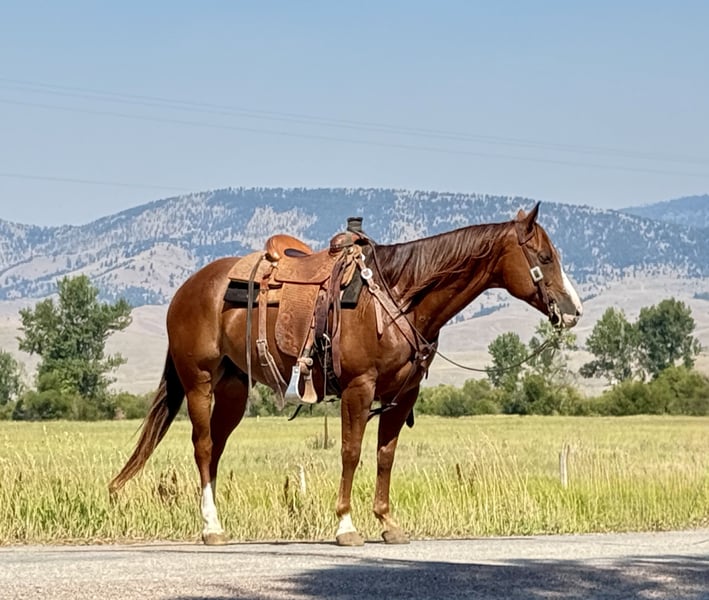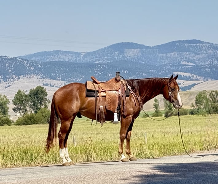 ♦️ 𝐭𝐡𝐞 𝐀𝐌𝐄𝐑𝐈𝐂𝐀𝐍 𝓕𝓪𝓵𝓵 𝓒𝓵𝓪𝓼𝓼𝓲𝓬 ♦️ Happening now thru MONDAY | OCTOBER 20th - Available EXCLUSIVELY on HorseBid's website! For more details and to register visit: www.Horsebid.com CONSIGNOR CONTACT: Flint Creek Quarter Horses 406-544-99987 LOCATION: Drummond MT BREED: Quarter Horse REGISTERED: No REGISTERED NAME: Tanquery COLOR: Sorrel HEIGHT: 15 AGE: 7 GENDER: Gelding Tanquery is a sorrel seven-year-old grade gelding that stands 15 hands tall. He is out of a Tanquery Gin bred stud, and a good cow horse mare that was not registered so he sells grade. This guy is a really nice ranch and trail horse that is very gentle and has a great handle on him. He is a fast walking, confident guy that is fun to go do any job on. He has drug calves to the branding fire and has roped and doctored lots of cattle in the pasture. He is really good too sort cattle on and will get down and dirty with a cow. He has a good one hand neck rein and operates really well. He will lope nice circles in the arena and has a big stop. Turns around both directions and will easily step to his correct leads. He would make a great team penning or sorting horse and would finish into a team roping horse easily. This guy is fun to take to the mountains to trail ride or gather cows on as he is a fast walker and will keep those bridle reins swinging. This is the kind of horse that I really enjoy riding. He is really good minded and tries hard to be a good willing partner with you. He crosses water and the other obstacles easily and has no bad habits. Good too shoe and haul and loves to get a bath when he’s done working for the day. He has never offered to buck or be silly with us and is the kind you can lay off until you need him and he will saddle up the same. He is trained to let you climb up on a stump or step and simply smooch to him and he will side pass over and make it easy to get on. He is a really nice using Horse that has class and eye appeal with a long mane that hangs to the bottom of his neck. this is a solid individual that is the perfect age. If you are in need of one like this, feel free to give us a call and come and try him at the ranch to see if it’s a good fit for you. Please call and we will tell you everything we know about this good gelding. call or text Tom at 406-544-9987.
