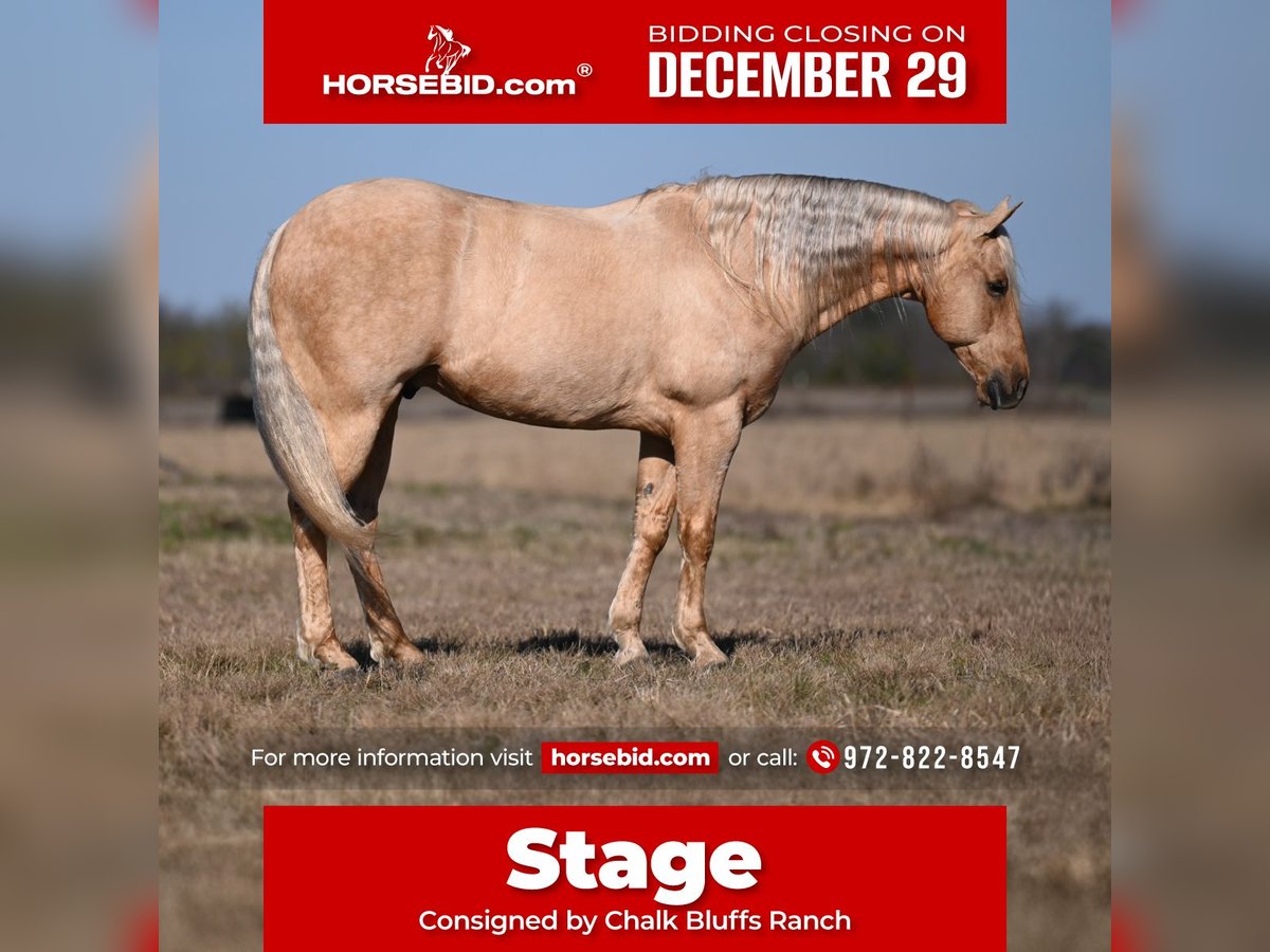 ⚜️ 𝓗𝓮𝓻𝓲𝓽𝓪𝓰𝓮 𝐖𝐢𝐧𝐭𝐞𝐫 𝓒𝓵𝓪𝓼𝓼𝓲𝓬⚜️ Happening now thru MONDAY | DECEMBER 29th - Available EXCLUSIVELY on HorseBid's website! For more details and to register visit: www.Horsebid.com CONSIGNOR CONTACT: Chalk Bluffs Ranch 972-822-8547 LOCATION: Mount pleasant TX BREED: Quarter Horse REGISTERED: No REGISTERED NAME: Stage COLOR: Palomino HEIGHT: 15.1 AGE: 7 GENDER: Gelding Meet Stage, a 7-year-old palomino gelding that’s the real deal and built to go to work. He is a seasoned ranch gelding** that has been used extensively on a large cow-calf operation, taking everything in stride from shipping, branding, and doctoring to long days outside. Stage is gentle, quiet, and very user-friendly**, making him a pleasure to ride whether you’re working cattle or just enjoying a day in the saddle. He stands 15.1 hands with a ton of frame and bone, giving him the substance and durability you want in a ranch horse. He rides easily in town, crosses water without hesitation, ties all day, loads well, and is good to shoe. Honest, broke, and dependable—Stage is the kind you can saddle up and go to work on, day after day. If you’re looking for a solid, good-minded palomino ranch gelding that’s already proven himself, Stage checks all the boxes.