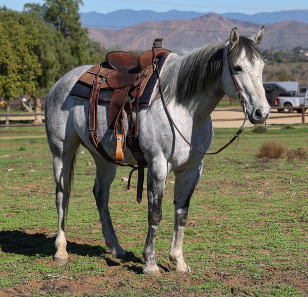 🎄𝐓𝐇𝐄 𝑯𝒐𝒍𝒊𝒅𝒂𝒚 𝐂𝐋𝐀𝐒𝐒𝐈𝐂🎄 Happening now thru MONDAY | DECEMBER 15th - Available EXCLUSIVELY on HorseBid's website! For more details and to register visit: www.Horsebid.com CONSIGNOR CONTACT: Crazy G Ranch 951-531-4346 LOCATION: Norco CA BREED: Quarter horse REGISTERED: No COLOR: Dapple grey HEIGHT: 15.1 AGE: 7 GENDER: Gelding Swig is a beautiful 7 year old quarter horse gelding! If your looking for a nice well rounded gelding that is built to last look no further! Swig is sure footed, with solid clean legs. This gelding will cover trails and is as solid as one comes with being exposed to all rocky terrain, steep mountains and city trails! He has been ridden all over the City of Norco, with barking dogs, heavy street traffic, trash bags, motorcycles etc! He has taken care of beginners on the trails and in the arena! Swig is a smooth ride and rides easy in the arena. He catches both leads, rides with a level head and has a smooth trot. Swig moves off the leg, side passes, opens and closes gates and will ride one handed with a neck rein or you can direct rein him! Swig has been roped off of plenty of times on the ranch, has dragged calves to the fire and has gathered. Swig is cowy and does well in the cow sorting ring! Swig has roped a handful of live cattle in the arena. Swig not only is well rounded in the western discipline but he also will ride English and is a beautiful mover! He has been over cross rails and can go further on with his jumping career! Swig would excel in any discipline, he loves to work, easy to get along with and he goes with the flow! Swig sells 100% sound. He has no scars, lumps, or bumps and has never coliced. Swig is easy to catch, tie, saddle and groom. He has a puppy dog personality and loves affection from humans!