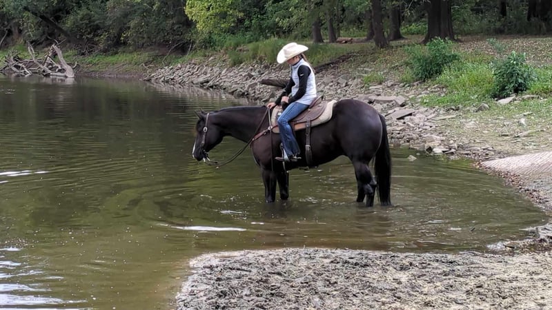 ONLINE AUCTION Place your bids at www.PlatinumEquineAuction.com Starting Bid $3500 Auction ends November 10th, 2024 Need a new saddle? Check out White Rock Saddles on our website or Facebook! Seeker is a 6-year-old, 16.1-hand black AQHA gelding, bred for western pleasure with splendid bloodlines, including his sire, the Quarter Horse Congress champion Night Moves, and his dam’s Zippo Pine Bar lineage. Weighing 1300 pounds, he is all muscle and moves with the elegance of a western pleasure horse, excelling both in the arena and on the ranch. He has been ridden extensively in various environments, from trails and camping trips to cattle work, proving himself surefooted, traffic-safe, and unbothered by obstacles like water, ditches, and bridges. This gentle giant has impeccable ground manners, standing perfectly still for saddling, bridling, and mounting, whether from the ground or a block. Seeker is a versatile and reliable mount for any rider, from children to seniors, having been ridden in places as diverse as the canyons of West Texas and Iowa’s wildlife reserves. He loves water, enjoys baths, and is easy to handle, with no bad habits or lameness. Up-to-date on all vet care, including shots, vaccinations, and dental work, Seeker also comes with a pre-purchase vet check and x-rays. He is equally comfortable living in a pasture or a stall. Seeker has been shown by our children in local 4H shows. Located in Lisbon, IA. Contact John McPhail 319-721-7714 with any questions. ONLINE AUCTION Place your bids at www.PlatinumEquineAuction.com Starting Bid $3500 Auction ends November 10th, 2024 Need a new saddle? Check out White Rock Saddles on our website or Facebook!
