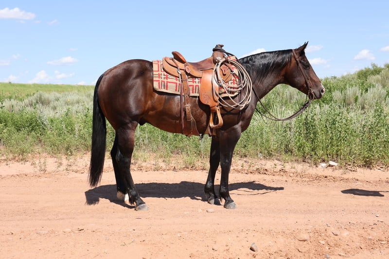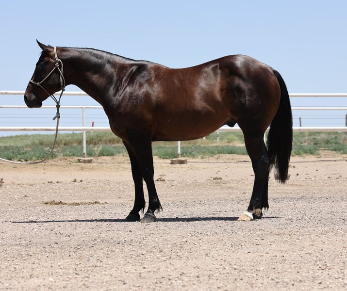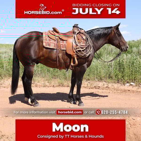 ♦️ MID-SUMMER SHOWCASE ♦️ Happening now thru MONDAY | JULY 14TH - Available EXCLUSIVELY on HorseBid's website! For more details and to register visit: www.Horsebid.com CONSIGNOR CONTACT: TT Horses & Hounds 620-255-4784 LOCATION: DALHART, TX BREED: AQHA REGISTERED: Yes REGISTERED NAME: JT BAILY MOON COLOR: BAY ROAN HEIGHT: 14.3 AGE: 9 GENDER: Gelding We are so excited to introduce to you, MOON! What a hunk he is. Quiet and safe, broke enough to do anything you want on him. He’s spent a significant portion of his life on a ranch, but he also rides nice circles in the arena. He stands like a gentleman at the mounting block, fence, or tail gate for you to get on or off. If you're out on the trail, Moon is as steady and easy-going as they come. He crosses water with ease, steps over logs, and has zero spook. He is safe around traffic, 4 -wheelers, drones, dogs, kids and even plastic sacks! Moon stands quietly for the farrier, loads and hauls with ease, and gets along well with other horses. His kind disposition and respectful nature make him a joy to handle and be around every day. Moon is 100% safe in every way and ready to go home to a family that can enjoy him! For more information or to come try him please call/txt 620-255-4784