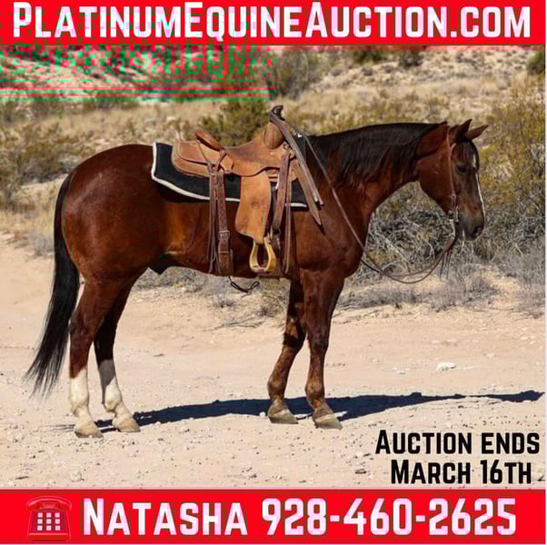 ONLINE AUCTION Place your bids at www.PlatinumEquineAuction.com Starting Bid $3500 Auction ends March 16th, 2025 Need a new saddle? Check out White Rock Saddles on our website or Facebook! Churro is an 8 year old grade gelding standing 15.1hh. If you’re looking for your next all-around gelding with a magnificent handle then look no further, Churro is your guy!!! This gorgeous gelding is as handsome and fancy as one gets. Churro will walk, trot, and lope both ways with ease as well as a fancy neck rein, great spin, big stop, and flawless sidepass. You can take this big handsome gelding absolutely anywhere and never have to get off, he will open gates from both sides with ease! When it comes to mounting, don’t worry about his size! He will park out and lower his back to be mounted, as well as stand like a statue at mounting blocks, rocks, fences, truck beds, you name it and he’ll stand like a rock until you’re comfortably in the saddle! Not only is this great gelding handy broke and gentle as can be, he’s an absolute gentleman on the trail! Rough steep terrain, flowing rivers, thick brush, fallen logs, you name it and Churro will go through it without batting an eye!!! Churro is easy to catch and good to groom, saddle, bridle, clip, shoe, bathe and load. Will come with a clean coggins and health!! Transport can easily be arranged anywhere in the US!!! Located in Camp Verde, AZ Contact D/C Equine Services Dallas 804-822-2233 Natasha 928-460-2625. ONLINE AUCTION Place your bids at www.PlatinumEquineAuction.com Starting Bid $3500 Auction ends March 16th, 2025 Need a new saddle? Check out White Rock Saddles on our website or Facebook!