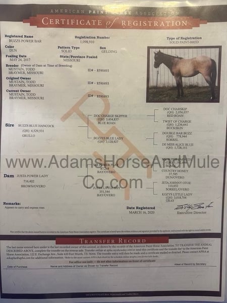 Ten koń sprzedaje się w Cannon Falls, MN 1 lutego i jest wysyłany na www.NorthStarHorseSale.com. Możesz licytować online, licytować osobiście i przyjść obejrzeć każdego konia i jeździć na nim przed licytowaniem. Wysyłka jest dostępna w dowolnym miejscu w USA. Cena wywoławcza 5000 dolarów, wszystkie konie sprzedawane są zdrowe. Jeśli chcesz czegoś innego, spójrz na Buzz's Power Bar! Buzz to Blue/Grulla Roan, który jest bardzo mocno zbudowany, stoi około 15,1hh i jest zarejestrowanym w 2017 roku wałachem APHA! Od lata Buzz zarabia na życie, pracując przy hodowli krów i cieląt. Robił wszystko, od sortowania po roping i leczenie. Zna się na krowach i ma mnóstwo krowich zmysłów. Jeździł w dużym terenie ze stromymi, nierównymi wzniesieniami. Buzz jest łagodnym typem konia, który wciąż ma wszystkie przyciski, których można chcieć. Zatacza przyjemne, powolne kręgi, łapie prawidłowe wodze, zatrzymuje się i obraca. Buzz jest zadowolony z poruszania się po szlaku i uwielbia jeździć w terenie. Potrafi przekraczać strumienie, rowy, kłody i poruszać się po nierównych, skalistych terenach. Buzz był wystawiony na wszelkiego rodzaju dzikie zwierzęta i pójdzie wszędzie, gdzie zostanie poproszony. Przejechał wiele kilometrów w górach i napotkał każdą możliwą przeszkodę na szlaku. Wjedzie lub zjedzie nawet po najbardziej stromych zboczach, przez głębokie strumienie, powalone drzewa i przez wszelkiego rodzaju trudny teren, zachowując przy tym pewność kroku. Buzz to koń, który może wykonać każdą pracę, która jest od niego wymagana, wykonać ją z łatwością i dobrze wyglądać podczas jej wykonywania! Zadzwoń do Erica 606-308-2461 po więcej informacji!