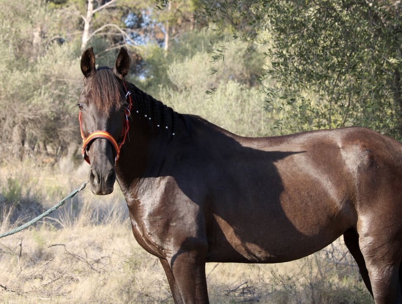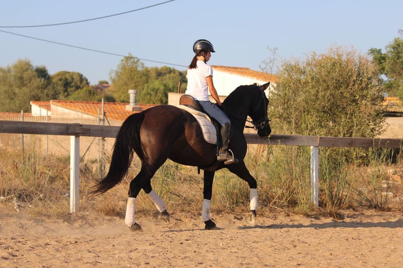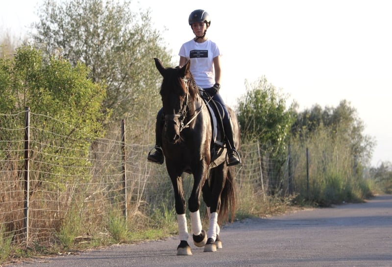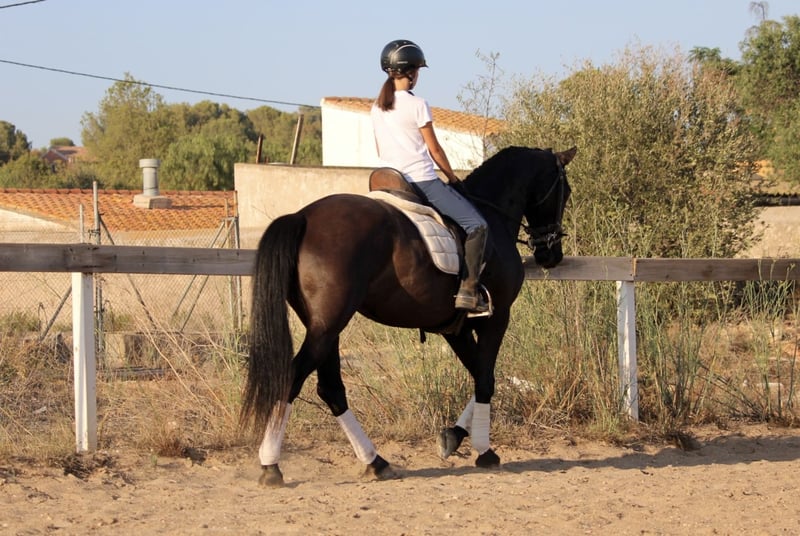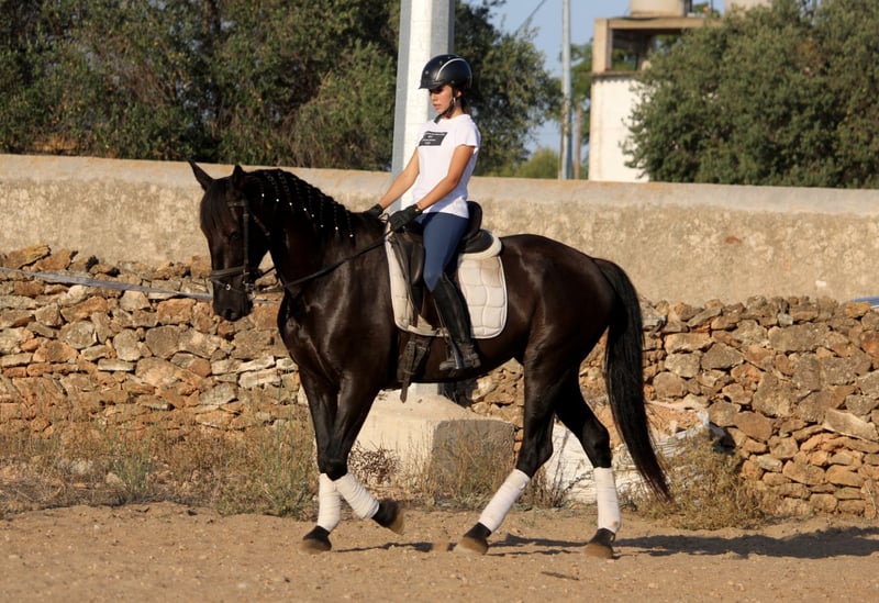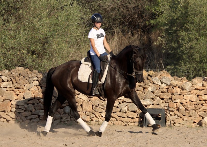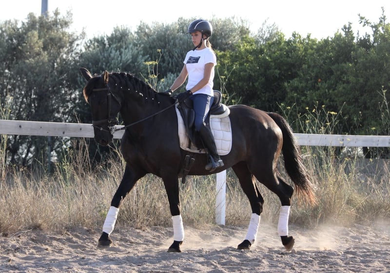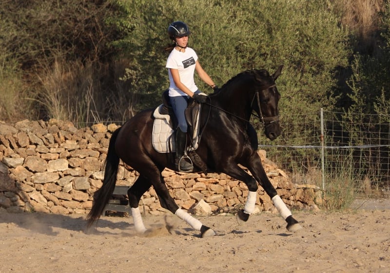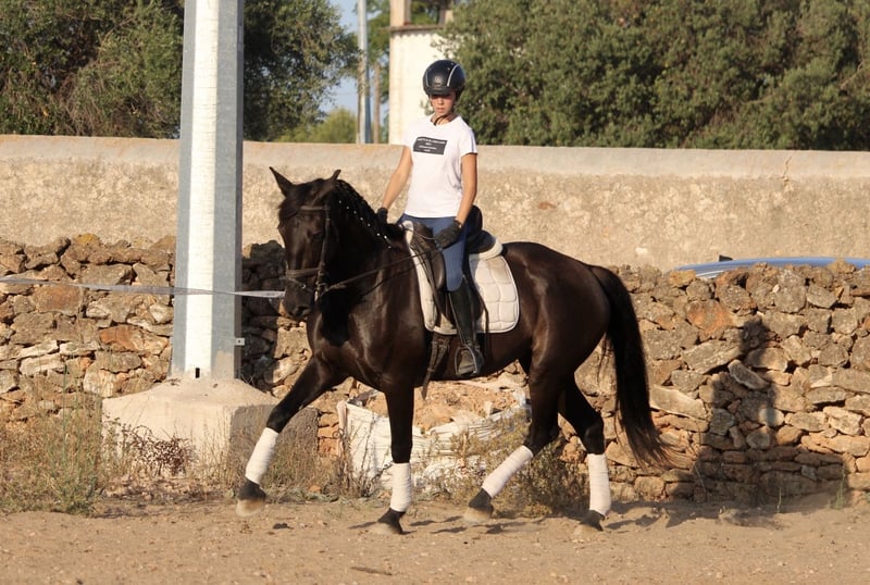 This chic lady in black has a lot to offer: great movements, a sporty and elegant appearance and a great, super honest and well-behaved character! She is currently also being used in advanced riding lessons with young riding students, where she is absolutely reliable and easy to ride. NIT - the night black - is also very experienced in cross-country and a real life insurance. A perfect horse for young riders or those returning to riding with dressage ambitions. NIT has been ridden correctly in the GGA and is currently being ridden professionally. She has a Spanish passport without pedigree. Location Spain.