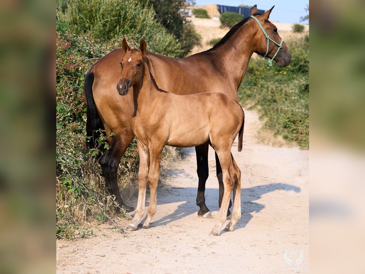 🏇 Ambar is an impressive Pura Raza Española (PRE) filly with a chestnut coat (ee), a white star on her forehead and another on the upper lip, with exceptional genetics. Registered with ANCCE, she is homozygous for the extension gene (ee), the well-known “little e”. Red mane and tail. 📆 Born on 27 May 2025 🧬 Outstanding PRE genetics: ♀️ Dam: Triana CCCXVI, a 1.70 m PRE mare, daughter of the great Deimos (1.80 m) from the prestigious Hnos. Tejedor Fdez. stud. Deimos is a grandson of Educado X (Hnos. Salvador Guardiola Fantoni), a Qualified, Improving and Elite Stallion, one of the most influential names in modern PRE breeding. ♂️ Sire: Pellon – Yeguada Militar “Pellon” is a black stallion born in 2016 at the Military Breeding Centre of Écija, standing 1.64 m tall. He stands out for his beauty, nobility and exceptional willingness to work, qualities he consistently passes on to his offspring. His genetics are impeccable: on the sire line he descends from Velero XI, one of the few stallions recognised by ANCCE as a Qualified Breeding Stallion and Young Recommended Breeder, a reference in sport; on the dam line he descends from Cepellon and Lego, as well as Lebrijano III and Bizarro XIV, some of the most important reproducers of the Yeguada Militar. Pellon has over 58 registered offspring, consistently producing elegant, functional and very expressive foals with top-level morphology and temperament. 🏆 Sporting potential and exceptional genetics: Ambar has everything to become an outstanding filly: impeccable breed morphology, convex profile and head, wide, functional and powerful movements, an exotic and highly valued coat, and a sweet, very easy temperament. Her pedigree guarantees quality and a strong future. 🩺 Health guaranteed: Any veterinary examination is accepted. Filly raised in freedom, perfectly socialised and well balanced within the herd. ✈️ National and international transport: We work with the best specialised equine transport companies. Request your quotation with no obligation.