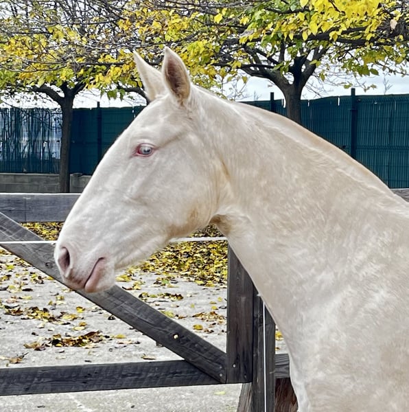 Perlino Pura Raza Española merrie uit de bloedlijn van Paco Martí. Ze is anderhalf jaar oud, barok in type, met een ramkop, sterke botstructuur en goede bewegingen. Ze zal een toekomstige fokmerrie worden, met veel lichaamsmassa en capaciteit om bijzondere nakomelingen te produceren. Geïnteresseerden voor meer informatie of om een bezoek te regelen, worden verzocht het in de advertentie vermelde nummer te bellen. Dank u wel. #perlino, #cremello, #roomkleurig, #verdund, #PRE, #albino, #fokkerij