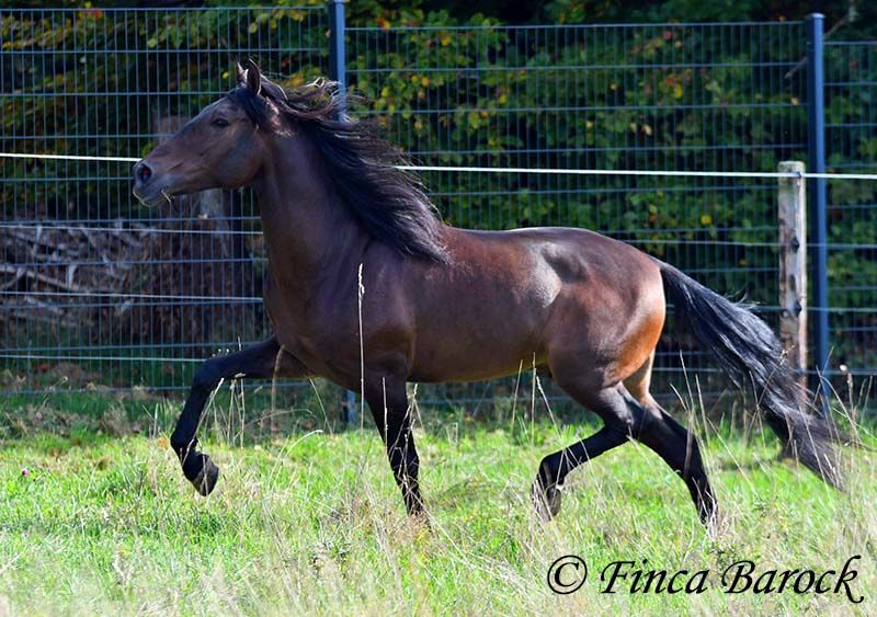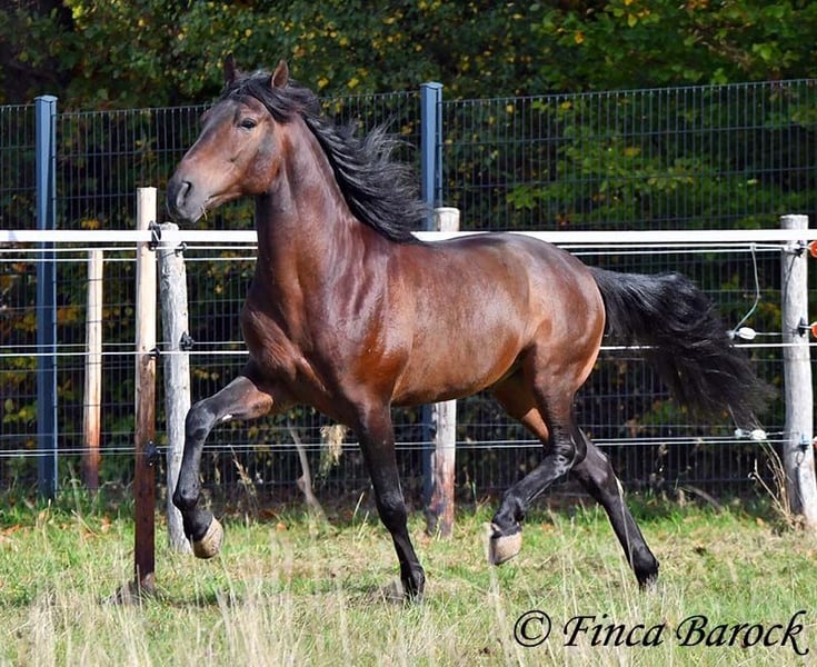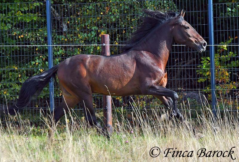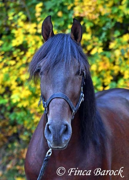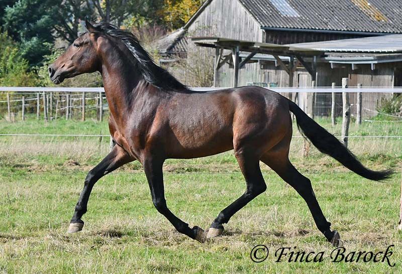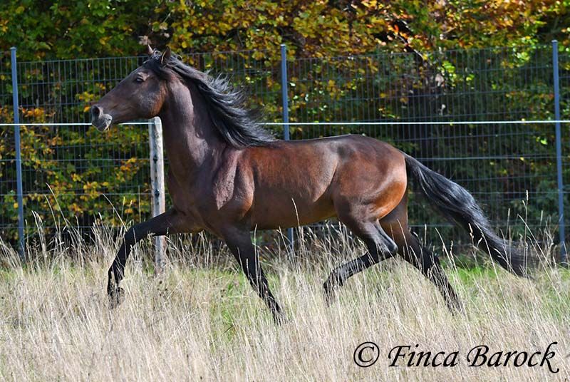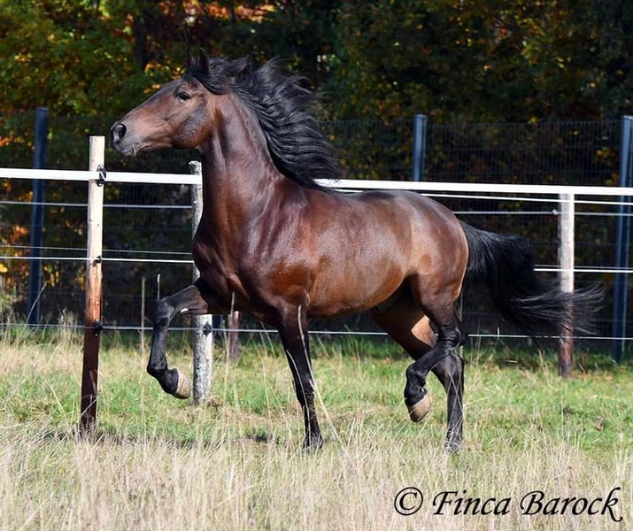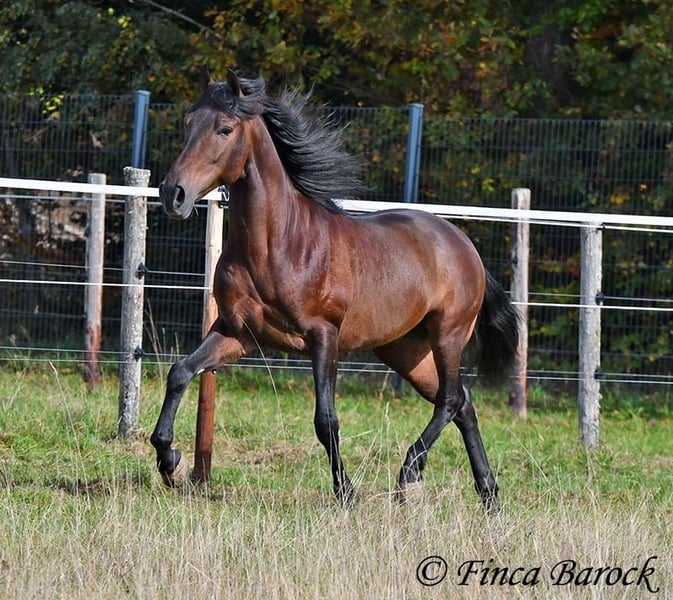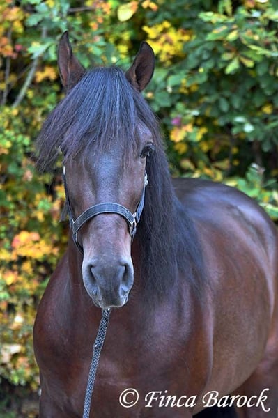 Breed: Andalusian Name: Historcio Gender: Gelding Height: 15.9 hh (159 cm) Date of Birth: June 6, 2020 Color: Dark Brown Price: €7,900 Sire: Unknown Dam: Unknown Historico is a slender, expressive young horse with a typical Campaneo gait. His dark brown coat and striking appearance make him a real eye-catcher. Initially, Historico needs a moment to settle in, but once he does, he becomes very attentive and affectionate towards his handler, enjoying long grooming sessions. He also likes to participate and often offers to be brushed or back-scratched. He can benefit from a variety of stimuli. A blanket in the stall? Perfect toy. A ball in the stall? He loves to play with it repeatedly. ❤️ Historico is experienced in trail riding and enjoys wandering through the woods. He has also shown himself to be exemplary in traffic. In the arena, we are continuing his training, and he already has a solid foundation, demonstrating a good willingness to learn. Overall, Historico tolerates small rider mistakes well. He tends to be a bit lively and may try to follow a slightly inconsistent rider, but he is by no means lazy or dull. He offers a stylish, energetic ride with comfortable movements. Includes clinical veterinary examination and X-rays. Contact: Finca Barock, Tel. 0173-696 31 81, 56291 Wiebelsheim