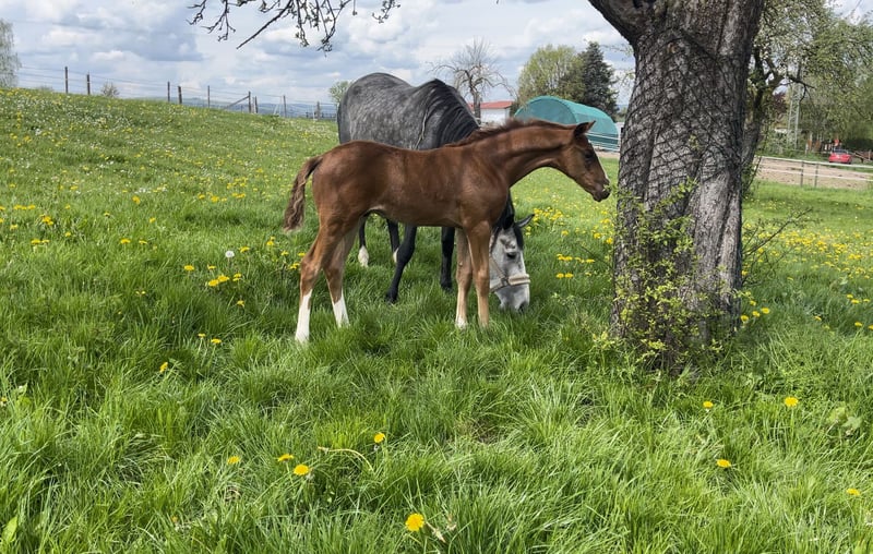 Noble stallion yearling who leaves nothing to be desired. Bred in the 5th generation at our stud farm, Ikar grows up carefully and age-appropriately in a herd of the same age. Our foals are accustomed to human contact from day one, without restricting their freedom. He has already mastered the foal ABCs such as farrier, basic tetanus immunization by the vet and leading with a halter with flying colours. He is characterized by a very correct conformation, many riding horse points and an expressive type. We can well imagine Ikar as a refiner or as a great riding horse. His sire Asagao xx already has several offspring who were successful at the BuCha in Warendorf. His dam Isolde is descended from Fandsy x, who himself competed at the World Championships for young eventing horses in France. A pedigree that is therefore very well known among (Anglo Arabian) breeders. He can move at any time or stay for further breeding. Further information also under www.gestuet-rhoen.de or by phone! Transport can be organized for an extra charge. Viewing is possible by arrangement!