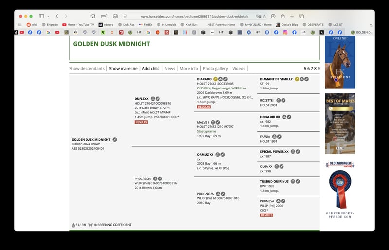 Golden Dusk Midnight (maj 2024) szuka nowego domu. Jest dobrze urodzony, atletyczny i ma obiecującą przyszłość w sportach jeździeckich, z 61% krwi Thoroughbred (TB), co czyni go szczególnie silnym kandydatem do skoków przez przeszkody. Jego ojcem jest znany Duplexx (Diarado/Heraldik xx), a matką Progresją, pochodzącą z linii słynącej z produkcji odnoszących sukcesy skoczków i wszechstronnych koni sportowych, z Thoroughbredami takimi jak Jape xx i Northern Dancer xx, oraz wykwalifikowanymi skoczkami, takimi jak Pavarotti Van de Halle, Quidam de Ravel, Quamiro i Ramiro Z. https://www.horsetelex.com/horses/virtualpedigree/240600 #skoki #końsportowy #duplexx #skoki przez przeszkody #heraldik #sportowy koń wierzchowy #Hunter