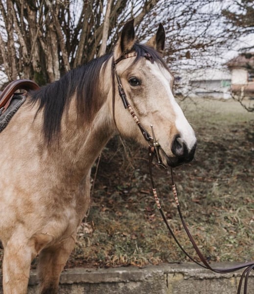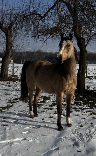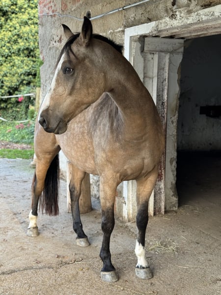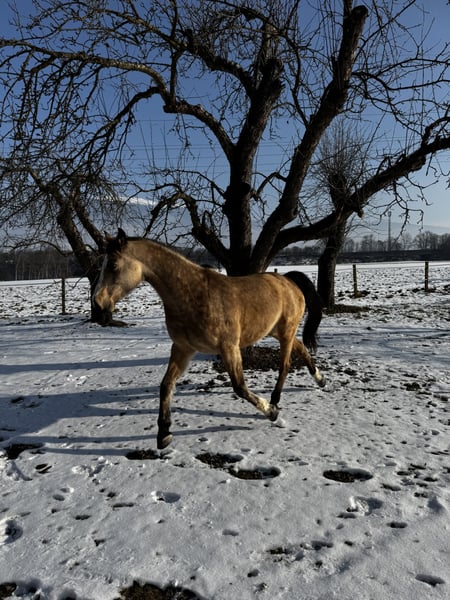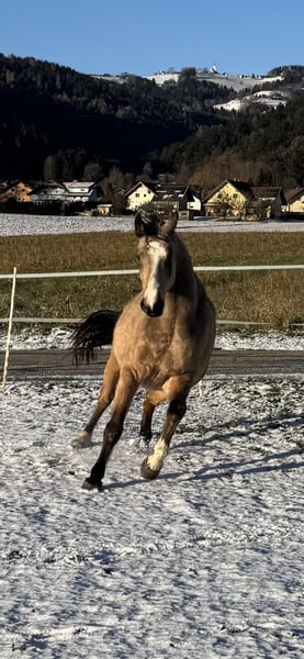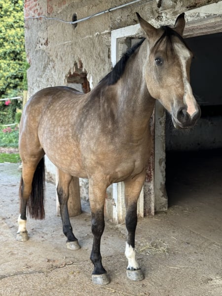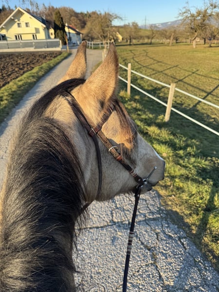 For sale: Beautiful 8-year-old warmblood gelding, buckskin, approximately 16.1 hh, registered with AES. Herd-compatible, has always been kept in an open stable, in excellent health, barefoot, never ill. Good farrier and loading manners, very well-behaved and affectionate in handling, extensively worked on the ground and in dressage, very sensitive to aids, soft in the mouth and on the bit. Easily moves away from the herd and into the terrain alone, no spooking or bolting. However, he is very confident and requires a consistent handler to guide him. If someone is unsure, he may respond with a buck. Traffic-safe, only slightly uncertain around trucks and tractors; no issues with cars, mopeds, bicycles, dogs, etc. In unfamiliar surroundings, he needs a little time to focus on his work. He also jumps very well and willingly, though he has not been actively promoted in jumping. Never shown in competitions, only a leisure horse, still very unspoiled. He is only being sold because we simply do not match. He needs the rider's confidence in the terrain, which I cannot provide due to my own nervousness. Only to a good home, no dealers. He should not become a trophy but find his place and a person who suits him, who can handle him properly and appreciates him.