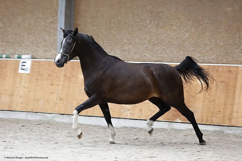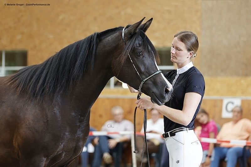 Beautiful, compact and correct young mare. Premium mare in the VZAP . Registrable in the Trakehner Verband. Sire Gabun has been licensed several times, elite stallion VZAP, won several medium (M) and placed up to advanced (S) level dressage, outstanding sire, Dam Camar Qalifa is elite mare VZAP, GP Trakehner. Dam of 3 premium mares and 1 licensed son. Not yet broken in due to lack of time, has already had a blanket with girth on without any problems and always tries to do everything right. A sensitive horse in a positive sense, not for the hectic or "fast and quick". Knows both a box in winter with a run and grazing 24/7 in summer. Calm and defensive in the herd. A jewel for connoisseurs and breeders due to his great genetics. For sale only in the best hands, as we have a dam and a sister in breeding. Photos: Knaack-Lindemann/Zoomperformance