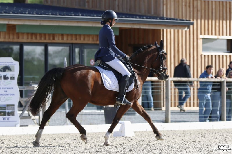 Joconde de Chapon is a promising 6-year-old pony, approximately 144cm tall. Trained at the Amateur 2GP level, she is ranked in the Amateur 3 and Amateur 2B levels. She has competed in the young pony circuit, achieving scores up to 70%. She still needs some training to be on the podium every weekend, suitable for both a child and an adult! She is well-liked at competitions, energetic, willing, and well-educated. Easy to handle on a daily basis, she is ridden and managed by children from the beginner level. Versatile, she jumps her small fences. She lives in the pasture with friends and has never had any health issues. Videos are available. Current on vaccinations and dental care. No X-rays have been taken to date (possible at the buyer's expense). Offered at 10k, located near Poitiers (86).