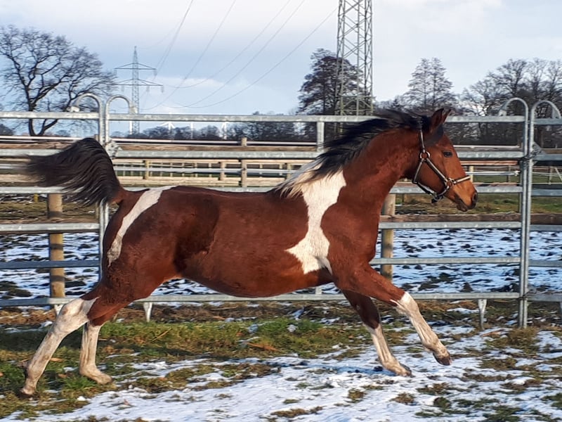 On April 4th, 2024, we welcomed a stunning Pintabian foal with 99.85% Arabian bloodlines. His appearance reflects his pedigree perfectly, and we are absolutely smitten. Sweatson Wiko Nibufa is halter-trained, knows how to be groomed, is accustomed to trailer loading, and is footed. He has been awarded a premium by the VZAP. His dam comes from a show line, while his sire is from a jumping and endurance lineage. He would also make a real eye-catcher as a leisure partner. His mother is a full Arabian mare, 14.8 hands, sired by IS Farah out of DG Maksus, very gentle and loyal in handling. Her pedigree includes Emigrant, Probat, Thee Desperado, and EL Perfecto. His sire is a Pintabian stallion with 99.7% Arabian blood, standing at 15.3 hands, licensed by the VZAP. He comes from the Khadra line of the HAB Dreamdancer foundation, with ancestors including GP Dakota Dancer, Padron, AR Emarald, and Balaton. Both parents are available for viewing on-site. Wiko has an equine passport with pedigree and vaccination record. He is regularly dewormed and has been seen by the farrier. A handsome boy with excellent character and outstanding potential.
