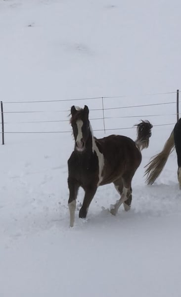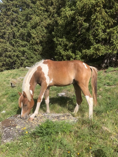 3.5-year-old Pintabian gelding for sale. He is accustomed to hoof trimming, halter trained, very gentle and human-oriented, but still somewhat untamed. He is sold only together with the Arabian mare Farianah (see my other listing).