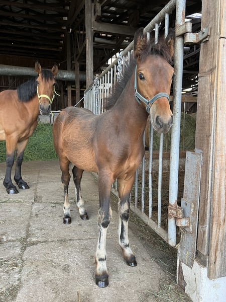Verkaufe hier unser kleines Hengst Absetzer Fohlen Fiorè. Er ist im März 2025 geboren und wird jetzt abgesetzt. Fiorè ist sehr aufgeschlossen, freundlich und neugierig. Er kommt immer sofort an den Zaun, wenn man ihn ruft. Er kennt das Fohlen ABC, also Führen, Hufe geben, Putzen, Halftern und überall angefasst werden. Fiorè ist auch bereits schon mehrfach Hänger gefahren, sowohl mit und ohne seine Mutti, und war dabei stets ein Musterschüler. Ebenso liebt er es gekrault und geputzt zu werden. Selbstverständlich ist Fiorè Stromzaun sicher. Er wird sicher ein Endmass von ca. 1,55m bis 1,60m bekommen, dementsprechend wird er Mal ein super Familienpferd. Seine Mutti (auf dem letzten Foto zu sehen) hat ein Maß von 1,50m, er wird aber größer werden. Momentan ist der kleine Mann 1,30m groß und wächst munter weiter. Der Pass für ihn ist beantragt, allerdings ist er noch nicht da, er bekommt einen grünen Equidenpass. Gechipt ist er bereits. Die Nummer ist auch vorhanden. Seine Farbe ist sehr schön, da er sehr Dunkelbraune und Hellbraune Stellen hat und keinerlei Abzeichen. Er steht momentan 24/7 auf der Wiese, kennt aber auch die Box mit täglichem Weidegang. Sollte der Kleine Schönling euer Interesse geweckt haben, schreibt mich dazu gerne an. Eine Besichtigung ist nach Termin Absprache selbstverständlich möglich. Privatverkauf, daher keine Gewährleistung, Garantie oder Rücknahme!