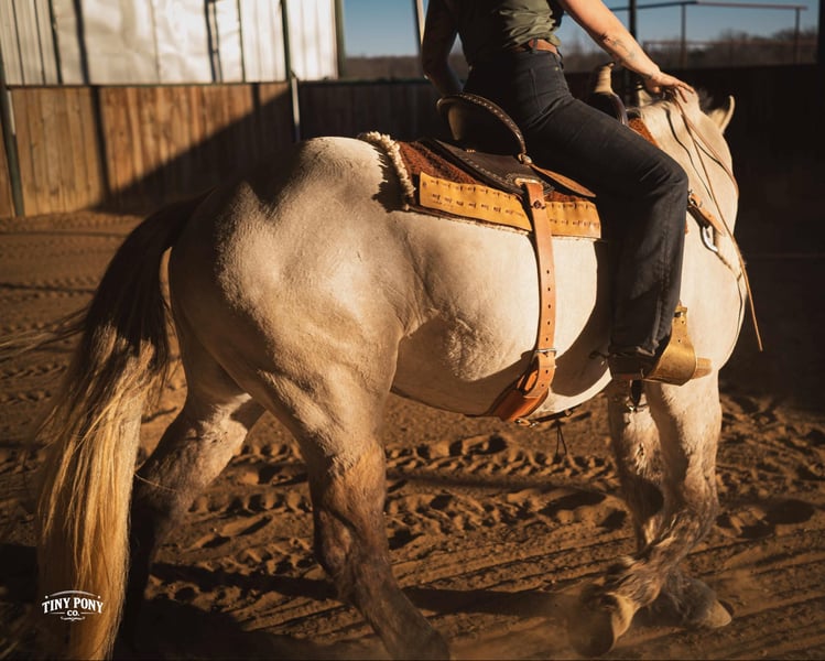 "AVAILABLE ON ONLINE HORSE AUCTION AT www DOT PlatinumEquineAuction DOT com BIDDING OPEN NOW thru SUNDAY | MARCH 15TH! *Final price will be determined on auction site* CONSIGNOR CONTACT INFO: Tiny Pony Co. 406-250-9530 LOCATION: Jacksboro, TX The horse that stays for the still, quiet moments. The one that always chooses your company, that makes you feel like the most important person on the planet - that’s Blackfoot. Not only is he rare in color and shape - not everyday you see a 15.2h line-backed silver buckskin Percheron/QH cross - but his calm, grounding energy is just as unique. He will happily put his head in your arms and stay that way as long as your heart desires. As a coming 4 year old, Blackfoot has a solid foundation and lovely manners. He will lope a circle, pick up all four feet, carry you down the trail, meet you at the gate, and put a smile on your face everyday. He is a solid traveler and enjoys off property adventures - he unloads confidently in new places. Blackfoot has been on field trips to other arenas where we have tested him out over low fences - and he has shown us two of the qualities we love the most : honesty and willingness. He is a comfortable ride, with three beautiful gaits - a lively walk, a soft, easy to sit trot and a smooth lope. He has learned to be responsive to leg cues and is already quite soft in the bridle. Blackfoot is easy to mount from the ground and stands still for you, every time. Flags, tarps, roping dummies, scattering chickens, darting barn cats - nothing seems to phase him. He will stand quietly and patiently on a loose, relaxed rein. With nice sized, sure feet and a strong, compact build, Blackfoot was born to carry weight. He would make an excellent backcountry trail mount, laid-back pleasure horse or your next personal therapist. This gelding has an easy going temperament and steady mind - he is the perfect example of why draft crosses are so popular - and we think the future is bright for this one. Blackfoot is relaxed in a herd, landing near the bottom of the pecking order. He also lives peacefully in a stall. He is currently barefoot and on a forage only diet - he has no trouble keeping his shape. He sells sound and UTD on vaccines - PPE welcome at buyer’s expense. Located in Jacksboro, TX. Text or call Courtney Maddux @ 406.250.9530 for with your questions!