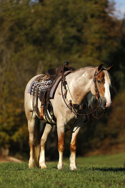 Waylon — wow, what a truly unique and eye-catching gelding we have to offer. He is a 2021 model, 15.2-hand red roan Gypsy Draft cross with a wide white blaze, four white socks, and a splash of white on his side that makes him stand out everywhere he goes. His color, shape, and kind expression make him one you will fall in love with the moment you see him. Waylon has been one of our trainer Nate’s personal horses for the past year, and it truly shows in his training and personality. He has been on countless trail rides, including moonlight rides, and always takes everything in stride and with charm. He is sure-footed and confident going up and down hills, over logs, and through creeks and water crossings. He loves trail rides, whether he is going out alone or with other horses and enjoys every minute of it. In the arena, Waylon knows his leads, has smooth, easy gaits, and side passes right up to the mounting block to make it easy for you to get on. He has been ridden western, English, and bareback, and he also drives, making him a truly versatile family horse. From the grandkids to the advanced rider, he is the kind of horse everyone can enjoy and feel safe on. Waylon is a gentleman to be around in the barn. He stands quietly for the farrier, in the wash bay, and for grooming — and he absolutely loves attention. The more love and care you give him, the more he gives back. He enjoys being part of the daily routine and is just as happy to greet you at the gate as he is going for a ride. He is well desensitized to tarps, jugs, gunshots, and whips. You can ride him once a day or once a week, and he stays the same solid and dependable partner. He has been turned out with other horses and gets along great with everyone. Waylon is traffic safe and has been on state roads, through town, and in parades, both ridden and hitched to a carriage. Waylon is truly one of those once-in-a-lifetime kind of horses — a beautiful, gentle, and dependable gelding with all the looks, training, and personality you could ask for. Whether you are looking for a trail partner, a family horse, or a trustworthy all-around gelding, Waylon will make you smile every time you see him. If this sounds like the horse that you have been looking for, please feel free to reach out to Duane @ 330-231-2324 for more information or to Schedule a day to stop by and see him in person.