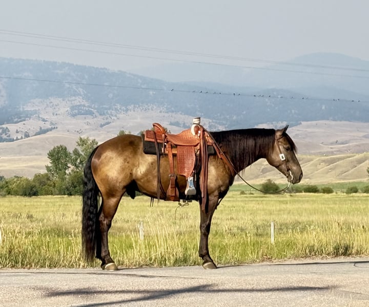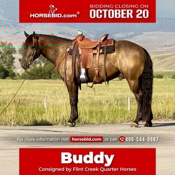 ♦️ 𝐭𝐡𝐞 𝐀𝐌𝐄𝐑𝐈𝐂𝐀𝐍 𝓕𝓪𝓵𝓵 𝓒𝓵𝓪𝓼𝓼𝓲𝓬 ♦️ Happening now thru MONDAY | OCTOBER 20th - Available EXCLUSIVELY on HorseBid's website! For more details and to register visit: www.Horsebid.com CONSIGNOR CONTACT: Flint Creek Quarter Horses 406-544-9987 LOCATION: Drummond MT BREED: Crossbred Quarter Horse REGISTERED: No COLOR: Buckskin/ Seal Brown HEIGHT: 14.3 AGE: 5 GENDER: Gelding Buddy is a 5 yr old crossbred grade quarter horse gelding that stands 14.3 hands. He is dark buckskin in the summer months and dark seal brown in the winter. He is a very friendly gentle guy that anyone that knows how to ride could get along with. He has been a ranch and trail horse his whole life doing all the ranch chores like pasture doctoring and pushing cows around. He will pull anything you can latch onto. He has a good one hand, neck rein and has all the proper buttons on him. He will step to his correct leads both directions and will lope nice circles. He will side pass to open and close gates and has a pretty good turnaround. He is trained to let you get on him off of a step or fence, simply Smooch to him and he will side pass over and make it easy for you to get on. He crosses water and all the trail obstacles and is a pleasure to ride outside. he is not buddy or barn sour and is use to riding off by himself and is the kind that will go all day and give you everything he’s got. He is a fun little gelding to ride that is fast walking and snappy when you need him to be but always quiet and gentle. He has absolutely no buck in him and is very easy to bathe, shoe, and haul. He will jump in the trailer with no problem and back out like a gentleman. This is a stout made guy with a lot of shape and bone. He’s got a big thick, wavy mane and a thick tail that drags the ground. this is a very nice young gelding at the start of his career that would make someone a great all around using Horse. Whether you want to take him to hunting camp this fall or back to the ranch, he is safe sound and ready to go to work. he is not an arena show horse by any stretch, but has been a working horse his whole life. If you think Buddy might be a good fit for you, give us a call and come and try him at the ranch. For more info call Tom at 406-544-9987