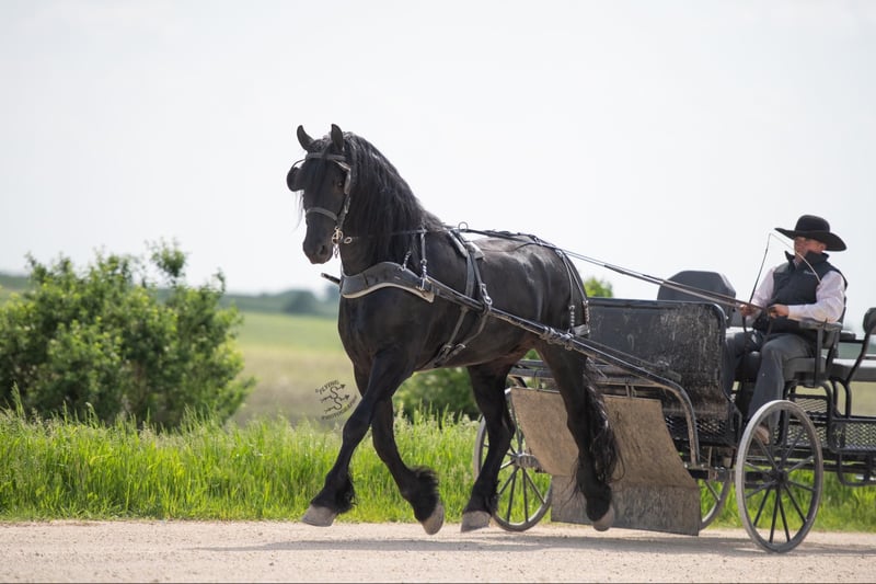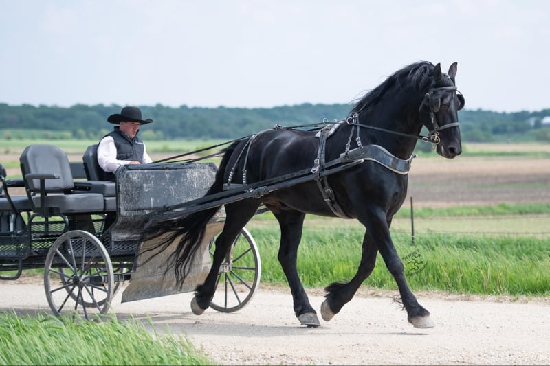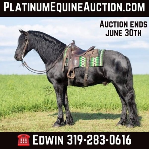 ONLINE AUCTION PLACE YOUR BIDS AT PLATINUMEQUINEAUCTION DOT COM $3500 STARTING BID AUCTION ENDS JUNE 30TH Have you been dreaming of owning that Once In A Lifetime Horse or Fairytail Type of horse if so I’ve got the perfect one for you! Meet Tornado Boy the coolest 5yr old Black Registered 75% Friesian 25% Morgan gelding that stands right 16.1 hands and is as pretty as they come with all the looks that Guaranteed will get you noticed wherever you go with him and on top of that he’s the most Gentle and people friendly horse I’ve ever owned,he’s one that could be content just being brushed and pampered on all day and absolutely loves it.Tornado Boy is a barn favorite and is a very special horse to us and will be hard to let go but very excited to find his forever home that he deserves,This special boy has been with us and in my program for a full year and I don’t think there’s one thing we haven’t done with this horse, he is as versatile and broke as they come it don’t matter if it’s Riding English,Western,Bareback,Bridles,Driving he’ll do it!And if you would like to take a stroll down town he sure will do that as well. Tornado Boy has seen every bit of all the outside miles riding out in open fields,he’ll go through rough terrain up and down steep hills, over logs and cross creeks and through belly deep water,goes through the obstacle courses,he’s one that you can cross the country with a nice loose rein and does it with ease no matter if it’s walk, trot or canter,and will lope nice circles out in the open fields,he has seen many miles on the roads in very busy traffic and down town,we’ve had him on over night trips he’s been out after dark many times both riding and driving and takes it like a champ .Tornado Boy is also very broke in the arena where he has a one hand neckrien,knows all leg cues and is very soft in the bridle and supple in his body parts,he has three very smooth gates W/T/C and for sure his canter, you could lope him all day and not getting tired of it,he will side pass,pivot,open/close gates and as you can see he does that all with out a bridle as well being ridden bareback with absolutely nothing on him that’s just how willing and the great mind he has and does good with the tarp,ball and bullwhip.Now let me tell you about how gentle he’s is and how much he loves attention Especially from little ones and you can feel 100% safe when they are around him,The niece and nephew sure have enjoyed playing with him and having rides on him,it don’t matter how old or how young you are he will take care of you and whatever you ask he will do so and as I haven’t mentioned he has seen many miles on the trails and absolutely loves it and is a dream to go trail riding. Tornado Boy has also had a lot of English riding and is doing great with that as well,he knows all his transitions, he’s doing great on his lateral work and sure is a pleasure to ride in English tack as well, he has that smooth uphill canter what people are looking for and also if you looking for a dream carriage driving horse Tornado Boy would be the one The whole family has driven him no matter if it’s through the day or in the dark he has done it and sure is a joy to drive and as you can see you can hitch him up by yourself and will stand patiently. Tornado Boy does great being stalled and out in pasture with other and never gets into trouble he’s always Quiet and takes care of himself.He is absolutely perfect to shoe my farrier has said many of times that he is a complete gentleman and does not flinch at all and that is a plus!He stands tied to be groomed,saddled and to mount and if you don’t have a stepstool you can take him alongside a fence or you name it and get on from there or lay him down and get on from there and that’s another thing he loves to do is laying down and will lay his head in your lap,he is also great being bathed.Tornado Boy is up to date on dewormer and teeth and is very healthy and stays sound, he is very easy to have around and a easy keeper. So if you’re looking for that true all round family safe type horse that is suitable for the whole family and is an absolute pleasure to have around you definitely wanna check out on Tornado Boy!!! The little ones call him pretty boy as a nick name for a reason! If you have any questions on this pretty boy or wanna set up a time to come see him in person please contact Edwin Raber 319-283-0616 NO TEXTS- I can only take calls and voicemails. Thanks