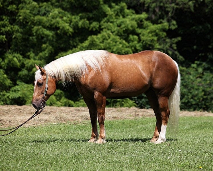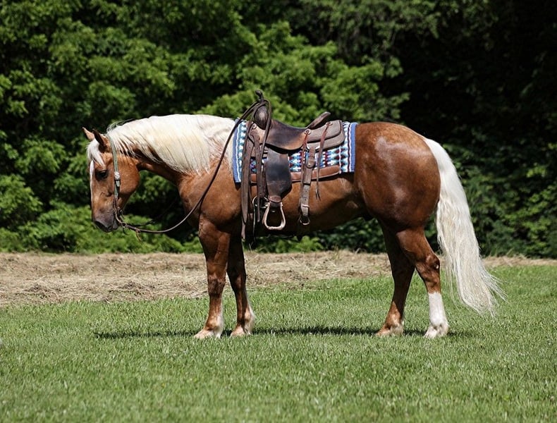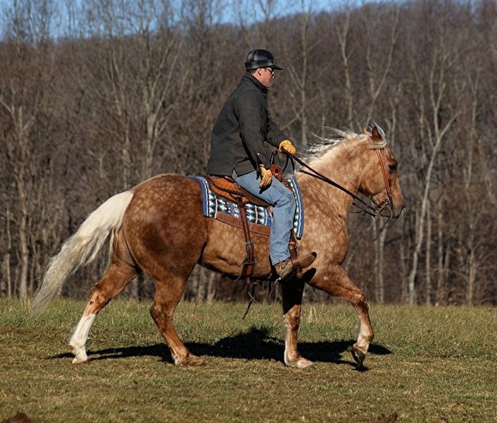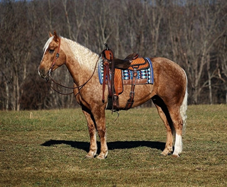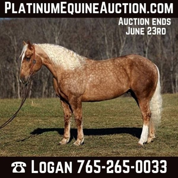 ONLINE AUCTION Place your bids at www.PlatinumEquineAuction.com Starting Bid $3500 Auction ends June 23rd, 2024 Need a new saddle? Check out White Rock Saddles on our website or Facebook! Dream horses do exist and Aspen is living proof of that! Talk about a horse that gets ALL of the looks where ever he goes!!! Aspen is a super stout built Golden Dappled Palomino Draftcross gelding standing around 15.2hh and he is 6 years old! In the fall/winter Aspen has more dapples than your eyes can count, as he is a high contrast dappled palomino. In the summer he is a dark golden palomino with chocolate highlights… he is always BEAUTIFUL!!! Aspen has been with us for almost 2 years now and we used him as my personal horse. He went through the natural horsemanship training and learned some tricks a couple years ago, where he would bow and lay down. Aspen has been used to around cattle and has caught wild ones, (roped/tied down), he has been used in the branding pen and used to doctor as well. He has been ridden down the highways, we have had him in town and he is very traffic safe. Aspen is great on trails and he will cross creeks, ditches, logs and navigate rough rocky areas. He has a smooth jog, a VERY VERY nice easy to set lope, a good stop, spins a circle both ways and backs with ease! He has been exposed to all kinds of wildlife such as deer or turkey or other animals like cows or dogs and will go anywhere that he is asked too. He has been rode many miles in the mountains of Eastern Kentucky and encountered every obstacle possible on the trail. He will go up or down even the steepest slopes, across deep creeks, over downed trees, and over all types of rough terrain while still being sure footed. Aspen is not cinchy, cold backed, does not crib or weave. Located in Level Green, KY. Feel free to call Moore Trained Horses Logan 765-265-0033 with any questions. ONLINE AUCTION Place your bids at www.PlatinumEquineAuction.com Starting Bid $3500 Auction ends June 23rd, 2024 Need a new saddle? Check out White Rock Saddles on our website or Facebook!
