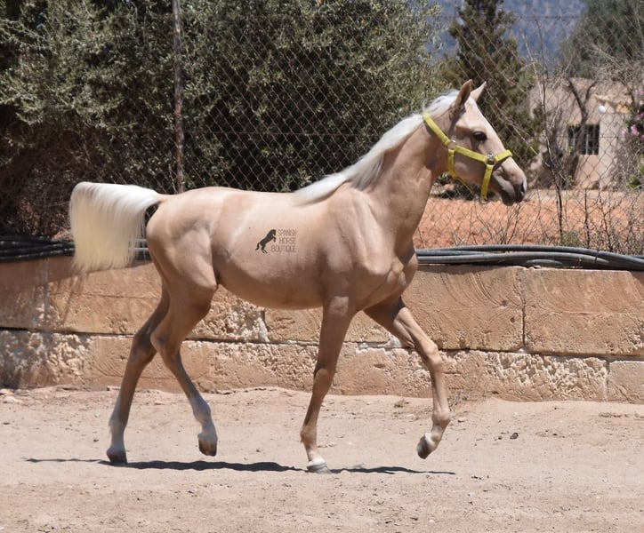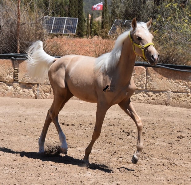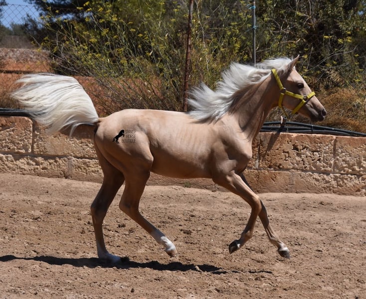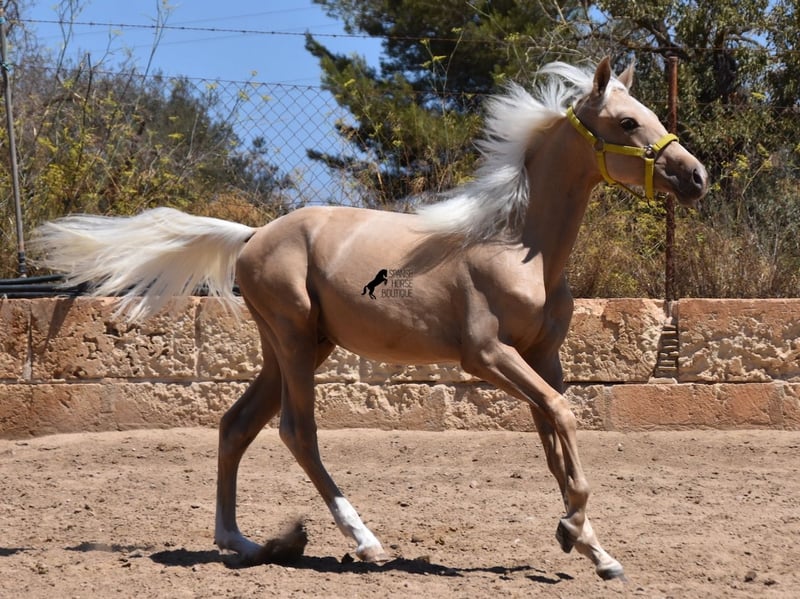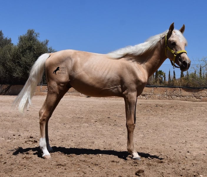 This golden treasure is very special on many levels. As an Azteca (or Aztec) he is a rarity in himself, because this wonderful breed, in his case by a Quarter dam and P.R.E. dad, does not come along very often. And then in the special color palomino, with a wonderful shimmer, what a jewel! But that's not the end of the special features, because this little rascal is already so light-footed and agile that he puts many big ones in the shade. The icing on the cake is that he is also an absolute cuddler! The breeder's daughter's favorite from birth, he's the spoiled darling, but you can't blame him for that - with his cute googly eyes, he simply wraps you around his finger straight away. When he then sweeps uphill, downhill and across the course, his already full mane in the wind, with his best movement, he definitely takes your breath away. The two white socks probably give his hind legs an extra boost, because he has very strong and agile hindquarters. On top of that, he is courageous and self-confident, typical of the breed, which will later make him predestined for working equitation, baroque riding, western and of course other disciplines. His expected final height is around 158cm and he is already chipped, so he will soon be ready to travel to your home to make your heart beat faster. He is currently in Mallorca! Videos and pedigree on request. I would be happy to organize an AKU, transport or even your trip if you come to see him in person. Details can be found on my website or in conversation. Saludos from Spain