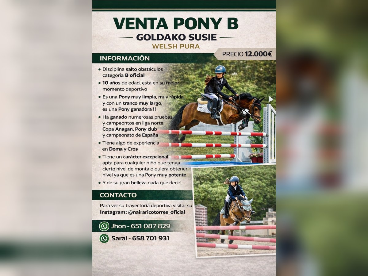 Disciplina salto obstáculos, categoría B oficial, 10 años de edad, está en su mejor momento deportivo, es una poni muy limpia, muy rápida y con tranco muy largo, es una poni ganadora, ha ganado numerosas pruebas y campeonatos en liga norte, copa Anagan, poni club de España, campeonato España de ponis, y ganadora de numerosos concursos locales, tiene algo de experiencia en doma clásica y cross Tiene un carácter excepcional apta para cualquier niño que tenga cierto nivel de monta o quiera obtenerlo ya que es una poni muy potente