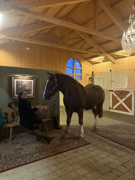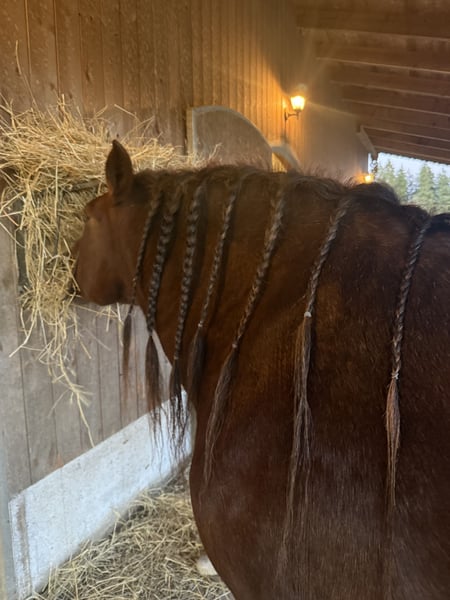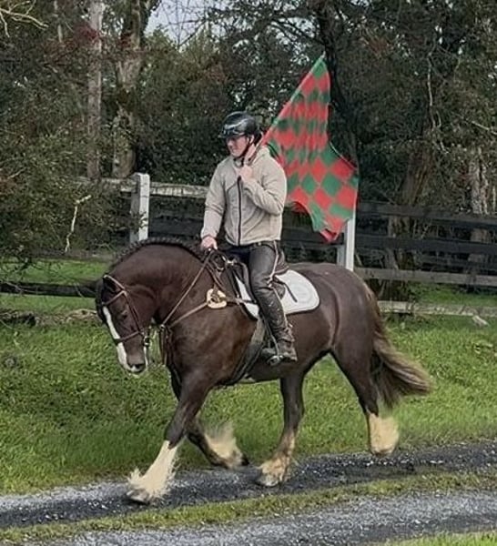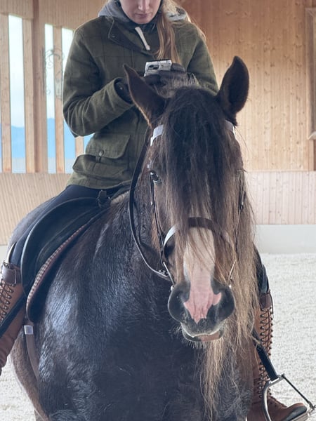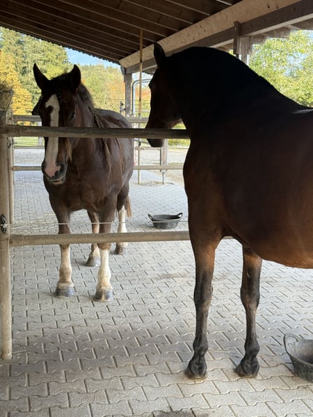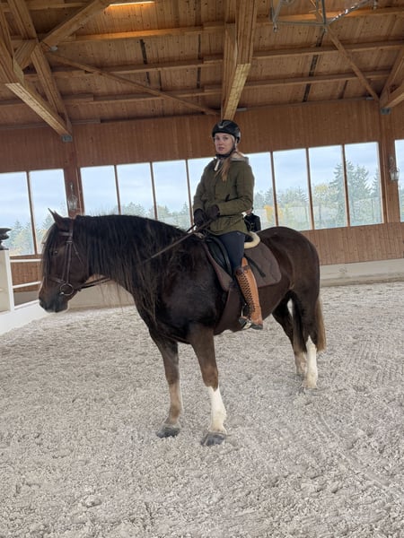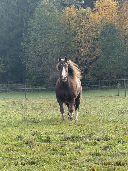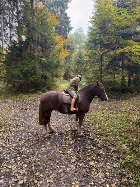 Super sweet Irish Cob mare, trail and hunting horse, ready for a new loving home. Beautiful 8-year-old imported Irish dream mare, hard to find a better one, yet full of spirit and with the most enchanting temperament you can imagine. She comes trotting when she sees you, seeking cuddles, and is extremely calm and well-behaved with all horses. Before arriving with us about four weeks ago, she was regularly used for hunting with a young rider. We haven't measured her yet, but she easily covers rider heights up to 180 cm (the rider in the pictures is between 170 and 203 cm). She is the ultimate all-rounder for trail riding, very easy to load, traffic-safe, fearless, and uncomplicated. Ideal as a trail or Western riding horse, or even for riding schools, as she is extremely gentle and patient. Due to her beauty and temperament (chestnut with three white markings and silvery-gray mane and tail), she is also a great candidate for breeding. We would love to see her in sporty hands where she can enjoy trail riding and receive the love she deserves. A very fair price for such an exceptional Irish dream horse: €9,999. Please contact via WhatsApp: 0176 23771159.