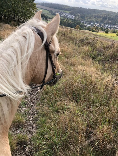 Hermosa y cariñosa y con mucha disposición, esta yegua busca una amazona (o jinete) segura que le brinde confianza y le ofrezca una vida variada. Penny tiene 9 años y fue criada en la estación de descanso de Odenwald. Por ello, su linaje es excepcional: su padre es un mezcla de Trakehner y Pinto, y su madre es una Connemara-Haflinger. Con una altura de aproximadamente 1,55 m, también es adecuada para jinetes de mayor tamaño. Penny es muy sociable, alerta y ágil. Le gusta moverse y, en ocasiones, puede estar un poco nerviosa, pero presenta trotes suaves y bien regulables. La vemos en disciplinas como TREC, Equitación de Trabajo, paseos de larga distancia y, sobre todo, para excelentes excursiones por campo. En doma, sin duda puede progresar, aunque no disfruta mucho del trabajo en la pista. Debido a su temperamento, NO es una yegua adecuada para niños o principiantes. Sin embargo, le encanta que la acaricien manos infantiles. Penny ha pasado toda su vida en un paddock y así quiere seguir. También puede caminar sin herrar sobre caminos asfaltados. Lamentablemente, en los últimos meses, debido a poca actividad ecuestre, ha engordado bastante. Sin embargo, no muestra signos de EMS, ya que come heno a libre disposición y pasta en verano en pastos abundantes. Es posible realizar una prueba de manejo en campo. Venta privada, por lo que no se aceptan devoluciones ni garantías. La creadora del anuncio es mediadora, no la vendedora del caballo, y no recibe ninguna remuneración.