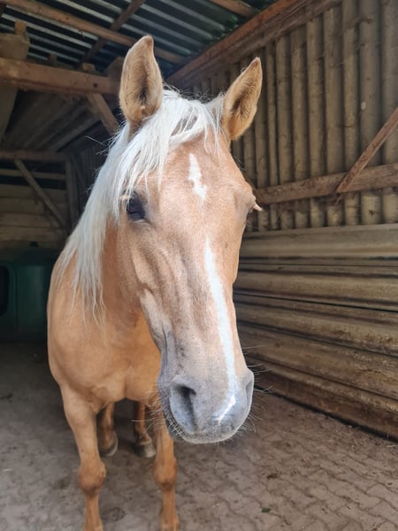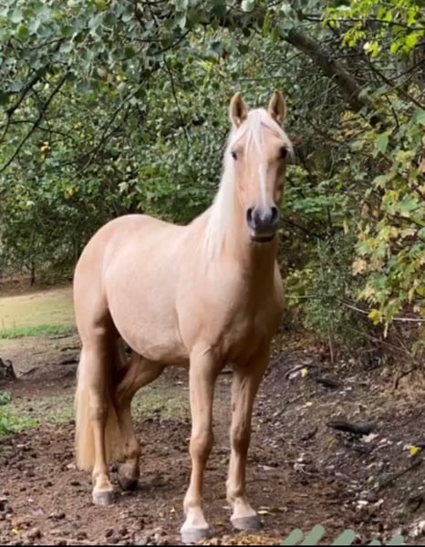 Beautiful, affectionate, and eager to perform mare seeking a confident rider (or equestrian) who can provide her with security and an engaging, varied life. Penny is 9 years old and was bred at the Odenwald Spa Stud. Her exceptional pedigree reflects this: her sire is a Trakehner Pinto cross, and her dam is a Connemara-Haflinger. With a height of 15.5 hh, she comfortably suits taller riders. Penny is very people-oriented, alert, and agile. She is eager to move and occasionally excitable, but she demonstrates smooth, well-regulated gaits. We see her excelling in disciplines such as TREC, Working Equitation, trail riding, and especially for enjoyable hacking adventures. While she could certainly be developed further in dressage, she doesn’t particularly enjoy arena work. Due to her temperament, she is NOT suitable for children or beginners. However, she loves and is accustomed to gentle petting from children. Penny has spent her entire life in an open stable and should continue to do so. She is barefoot and can walk over paved paths comfortably. In recent months, she has become somewhat rounder due to limited riding, but there are no signs of EMS, especially with free-choice hay and lush summer pasture. Trial rides in the terrain are possible. Private sale, therefore no returns or warranty. The seller is an intermediary, not the owner, and receives no compensation.