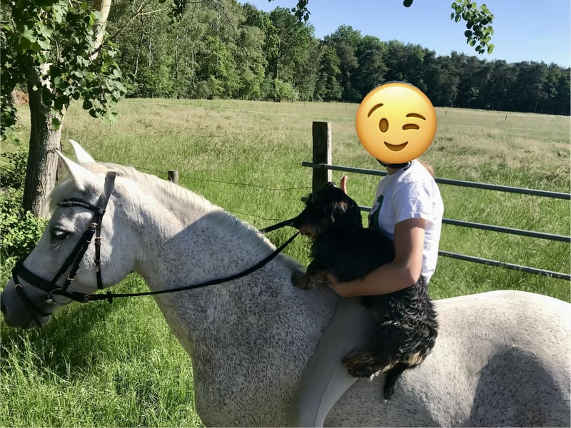 Für unsere 19-jährige Connemara-Ponystute suchen wir einen besonderen Platz bei besonderen Menschen. Rosi ist eine unglaublich liebe, menschenbezogene und feinfühlige Ponydame. Sie genießt die Nähe zu „ihren“ Menschen sehr, liebt es geputzt und umsorgt zu werden und freut sich über abwechslungsreiche Beschäftigung. Im täglichen Umgang zeigt sie sich unkompliziert, freundlich und zuverlässig. Nach einer verletzungsbedingten Stehpause wird sie derzeit behutsam wieder antrainiert. Rosi ist vielseitig ausgebildet, kann jedoch nur noch eingeschränkt geritten werden. Ruhige Schrittrunden im Gelände sind für sie gut möglich und bereiten ihr Freude. Wir können uns Rosi wunderbar im therapeutischen Bereich vorstellen – durch ihr sanftes Wesen bringt sie dafür beste Voraussetzungen mit. Auch als liebevolles Beistellpferd wäre sie eine große Bereicherung. Auf einem Auge ist Rosi blind, was sie im Alltag jedoch nicht beeinträchtigt. Wir wünschen uns für sie ein wertschätzendes Zuhause, in dem sie weiterhin Aufmerksamkeit, Zuneigung und sinnvolle Beschäftigung bekommt. Bei ernsthaftem Interesse beantworten wir weitere Fragen sehr gerne in einem persönlichen Gespräch.