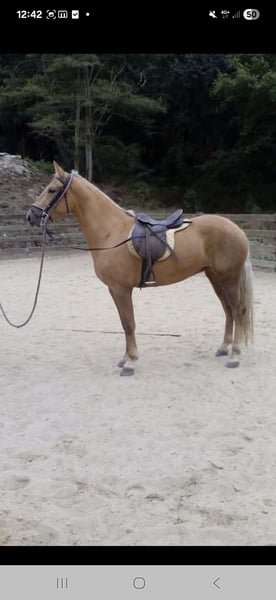 Se vende yegua cruzada palomina de 14 años y 1,58 m. Yegua muy llamativa por su capa y presencia, ideal para quien busque un caballo diferente para disfrutar. Trabajada en doma vaquera y acostumbrada al trabajo. Apta como yegua de ocio y para quien busque una yegua con buenos aires y bonita puesta en pista o en exhibiciones. La yegua se entrega con un potro macho muy bonito a su lado. Se encuentra en Santiago de Compostela (España). Se vende por cambio de situación laboral / económica.