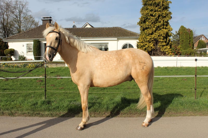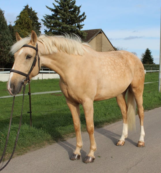 We are offering an eight-year-old Palomino gelding named "Perla" for sale. He arrived directly from Spain with all necessary health checks and has been in Germany for over a year now. In Spain, he was successfully competed at A-level dressage, and we have continuously trained and developed him further here on-site. Perla is exceptionally gentle and easy to handle, making him a very manageable ride in daily handling. Thanks to his extensive experience and loving temperament, he is ideally suited as a beginner's horse, yet also offers great potential as a motivated and trainable partner for ambitious riders. He is shod on all four hooves, has been regularly seen by the veterinarian, and shows no health issues. Visits and test rides are available at any time by prior appointment.