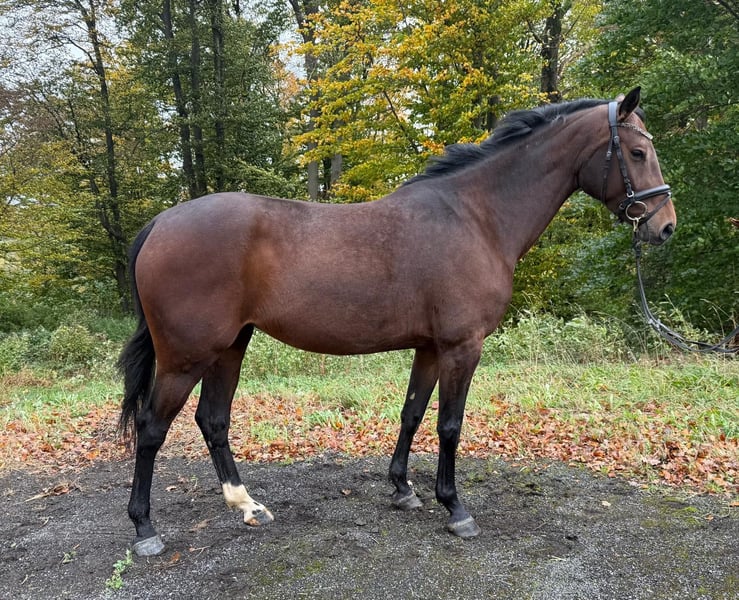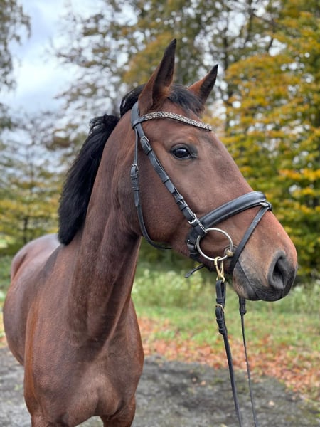 For sale is a stylish bay mare with an approximate height of 16.1 hh. She is by Louis Le Bon (by Lancer II) out of an Arpeggio mare, combining proven jumping and performance bloodlines in her pedigree. The mare has been with us for nearly two months, during which she has been gently backed and consistently shows herself to be well-behaved, curious, and cooperative under saddle. She is also uncomplicated and friendly in daily handling. She has three beautiful, rhythmical basic gaits. She has not yet been able to be free-jumped at our facility due to lack of suitable facilities, but she has calmly and bravely cleared small jumps under saddle. For her further training, we wish her a loving new home where she can develop her potential—whether in leisure riding or with prospects for sport. She has all the qualities to grow into a wonderful partner with the right guidance.
