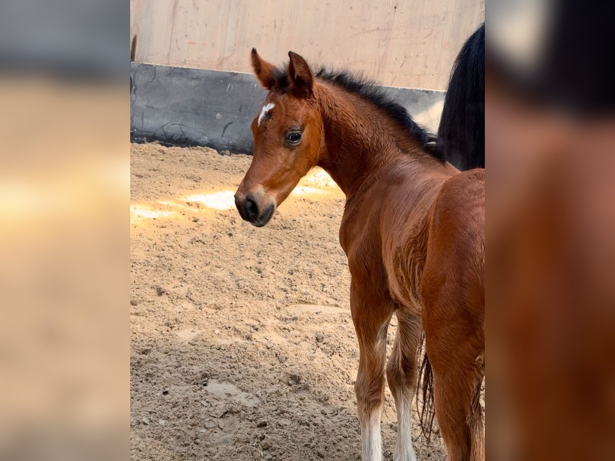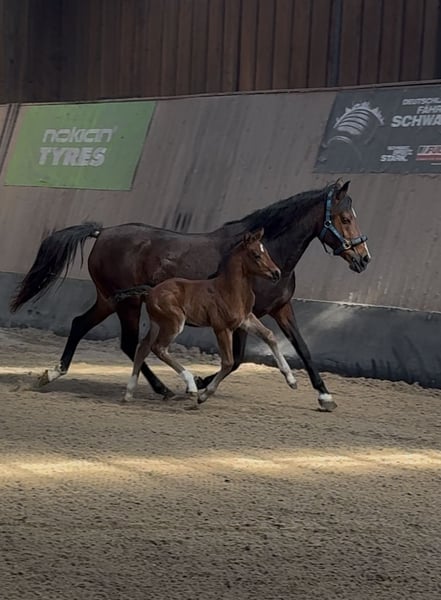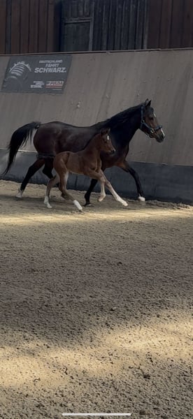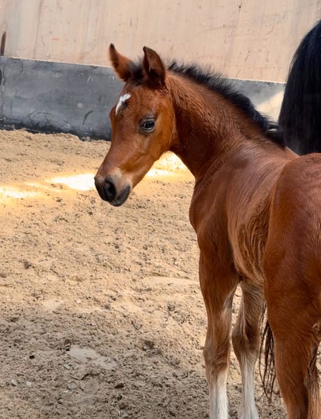 **Sales Advertisement: German Riding Pony Stallion** For sale is a promising German Riding Pony stallion, born in 2025. He presents himself in a beautiful, elegant bay and impresses with his harmonious stature and friendly disposition. This stallion is ideal for sport or breeding and already shows promising approaches in his movement pattern. He is well-socialized, familiar with handling other horses, and has already gained initial experiences in various environments. His movements are smooth and expressive, making him a real eye-catcher. If you are looking for a talented and affectionate partner for sport/breeding, then this stallion is just right for you! If you are interested or have further questions, please feel free to contact me.