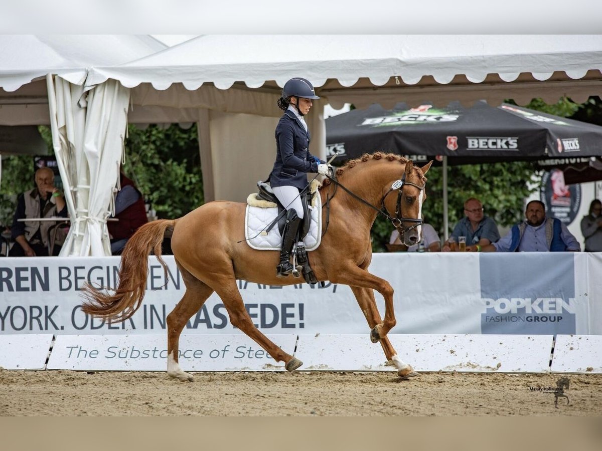 Donnermond es un poni alemán de doma, aprobado como semental de alto rendimiento. Aprobado en Rheinland-Pfalz-Saar, Westfalia y Hannover. Evaluado en Münster-Handorf con excelentes notas (8,0 en manejabilidad). Semental de alto rendimiento. Presentado en la Bundesstutenschau en Berlín, con premio. Colocado en competición de nivel A en doma clásica. Clasificado para el Campeonato Federal (de 5 años). Nivel de entrenamiento: L en doma clásica / FEI / en bocado. Le encanta salir a pasear y, incluso sin silla, pasa por todo con una cuerda de cabeza. Su madre es una yegua de élite. Un medio hermano acaba de clasificar para las campeonatos de Frisias, y otro hermano aprobado ha obtenido excelentes resultados en concursos de ponis y en el campeonato regional. Buscamos un hogar excepcional, con conexión familiar y acceso diario a pastar. Donnermond puede estar en cercado con ponis enanos o con otros machos, lado a lado; le encanta acurrucarse. Solo entregamos en manos de personas responsables y comprometidas. Necesita su tiempo diario en el campo. Queremos un hogar para siempre, preferiblemente con instalaciones propias o en una finca. Donnermond no muestra interés en concursos y no es fértil. Actualmente, está en entrenamiento en Lüneburg, con acceso diario a campo y contacto con otros caballos; está muy feliz con ello. Pero, dado que su descanso no es gratuito, queremos aprovechar esta oportunidad para encontrarle un hogar maravilloso.