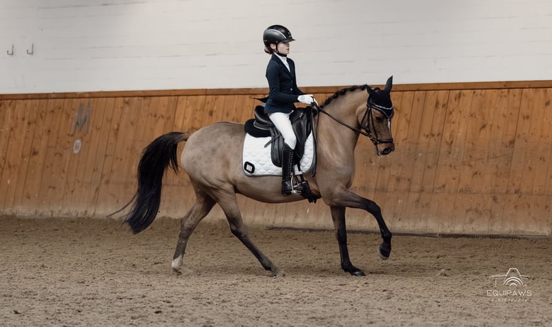 Great mare from the legendary Dornik B with a wonderful character for children. We have had her since she was 4 years old. Dreamy is absolutely well-behaved, can be loaded and unloaded by children, and has no issues with the farrier (shod twice). She is placed in E & A dressage, performs all L-level exercises (including traversals), and also goes out on trails without any problems. She has also had a foal by Dallmayer K with us. Overall, she is a truly fantastic children's pony with plenty of drive.