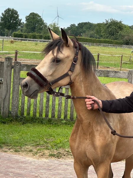 DINA FLEUR, een droompony voor fokkerij en sport. Dina Fleur is geboren in 2023. Dit zeer mooie Dating x Vincent bruin-isabelkleurige merrie valt op door haar expressieve verschijning en haar goede beweging. Ze is bij ons geboren en is opgegroeid in een meergeneratiegroep. Ze is halstergebroken, goed opgevoed en is gewoon leuk in de omgang. Ideaal voor ruiters die op zoek zijn naar een jong eindmaatpony (nu 1.45m) met perspectief, of het nu voor de sport of voor de fokkerij is. Ze komt uit een zeer succesvolle ponylijn, die teruggaat op talrijke goedgekeurde zonen tot aan de Bundeschampion. Bij interesse of voor meer informatie staan wij graag tot uw beschikking.