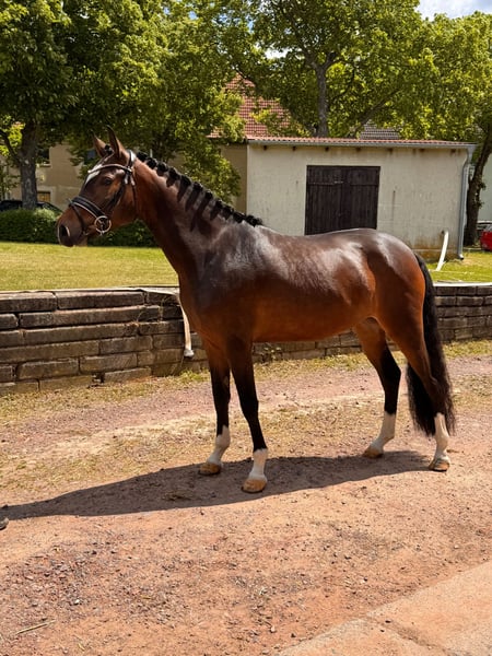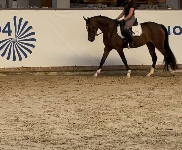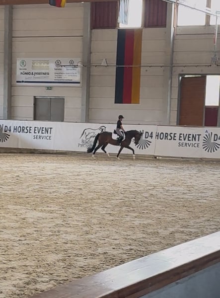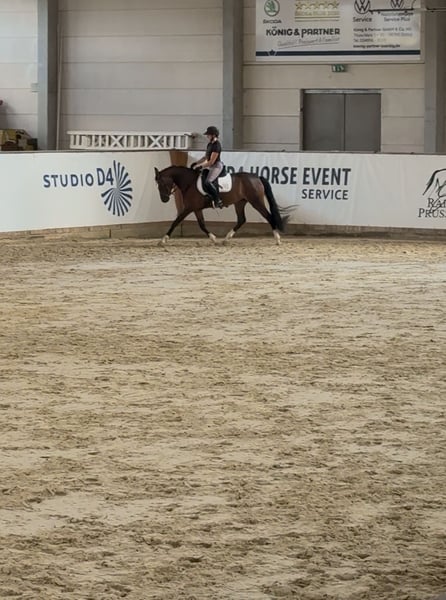 **Sales Advertisement: Charming German Riding Pony Mare** For sale is a beautiful German Riding Pony mare, born in 2022. With her elegant brown coat and a height of 150 cm, she is truly an eye-catcher both in appearance and character. This talented mare shows great potential in dressage and is well-suited for ambitious riders who enjoy training a young horse. She is well-mannered, well-educated, and already shows initial progress in her work under saddle. Our mare is healthy, regularly vaccinated, and dewormed. She is familiar with handling other horses and is manageable both in a herd and alone. If you are looking for a loving and talented partner for the future, we look forward to your message. Video available. State premium candidate!!! Current vet check available!!! Trial riding possible by appointment. Trial riding costs €30 and will be deducted from the purchase price.