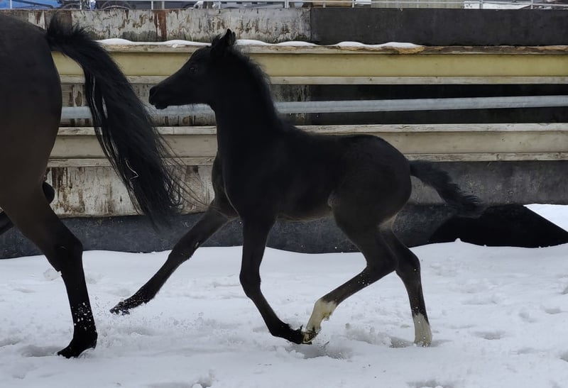 Unique opportunity: Due to a change in breeding focus, we are offering this exquisite broodmare for sale. Angel was in professional training for six months and has since been used exclusively for breeding. She placed 3rd at the Elite Mare Show and was the winner of the SLP mare class, impressing especially in jumping and rideability. She has a very promising black colt by the stallion PH No Problem at her feet and is currently pregnant by him again. Angel is being offered solely due to lack of a rider and a shift in breeding plans. She could certainly make a very good riding pony once re-trained. A sale including the foal is possible immediately, and the return of the foal could also be considered. Her color is Smokey Black, which could not be selected.