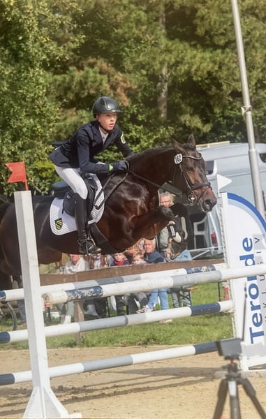 Due to the end of my son's "pony age," we are selling our 8-year-old full-sized mare Gwendolyn. The pony has achieved wins and placings in show jumping up to 1.15 m (has jumped up to 1.25 m) and in eventing up to CCIP**L level. Last year, Gwendolyn was part of the national eventing squad. She jumps very confidently and carefully, so we can also see her competing in show jumping. Stopping is not an option for Gwendolyn. Due to her temperament, her eagerness to move forward, and her always positive attitude towards jumping, she is not suitable for beginners or small children. Gwendolyn is straightforward and gentle in handling. She is healthy but occasionally nicks herself when she has opportunities to rest her hooves in the box, which is why we are offering her below market value. Her unconditional willingness to perform and her excellent attitude towards sport are remarkable. Thanks to her size, she also suits larger riders.