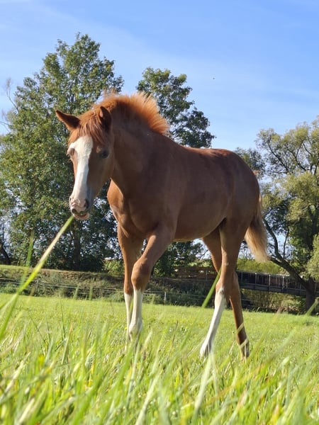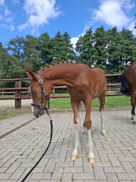**For Sale: German Riding Pony Filly Foal** For sale is a promising riding pony foal. My Mathilda led the ring of filly foals at the foal show with a score of 8.4. As a result, she has received the coveted foal premium. She was born on April 8, 2025. This beautiful filly not only impresses with her striking colorful chestnut coat but also with her friendly disposition and high willingness to learn. "I can imagine my Mathilda in all areas of riding. Her parents are both accomplished (mother placed in S dressage, father placed in L dressage and L jumping, as well as presented in eventing up to L). Both can be viewed with me! This charming and feminine filly presents herself in a sporty manner with a lot of charisma. She always trots with rhythm uphill, with a relaxed swinging back and plenty of push and energy from behind. Even in the walk, she shows herself to be relaxed and clearly overstepping. She grows up in a herd environment, is familiar with haltering, leading, grooming, farrier work, and loading. Of course, she has already been dewormed multiple times and has a horse passport with proof of lineage. I wish for her a horse-appropriate upbringing as well as a supportive home later on, with heart and understanding. If you are interested or need more information, please feel free to contact me! We look forward to your message.