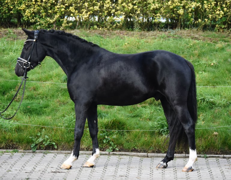 Zu Verkauf steht dieser schicke 3-jährige, 146cm große Rappwallach von FS Numero Uno x Popcorn WE. Nightclub ist in diesem Sommer angeritten worden, sogar von Anfang an immer auch mit Kindern im Sattel und auch viel im Gelände. Er ist sowohl im Umgang als auch unter dem Sattel ein absolut braves Pony ohne Unarten und überzeugt mit einer beispiellosen Gelassenheit. Sämtliche Alltagssituationen bringen ihn nicht aus der Ruhe. Abstammend vom Spitzenvererber FS Numero Uno bringt er zudem drei sehr gute Grundgangarten und ein ganz hohes Maß an Rittigkeit mit. Nightclub vereint beste Bewegung mit einem einmaligen Charakter und bringt somit auch alles für den FEI Sport mit. Aktuell ist er sein erstes Turnier mit Bravour gelaufen und zeigt auch hier dieselbe Gelassenheit und immer positive Arbeitseinstellung wie zuhause. Ein tolles Nachwuchspony, was in seiner Ausbildung immer Freude bereiten wird. Es liegen aktuelle Röntgenbilder vor. ‼️Bei Interesse und für Videos bitte ausschließlich telefonisch oder über WhatsApp unter 017621729218 melden. Anfragen über ebay oder ehorses werden nicht beantwortet.‼️ Das Pferd wird nicht zur Verfügung gestellt und kann auch nicht auf Raten gezahlt werden.