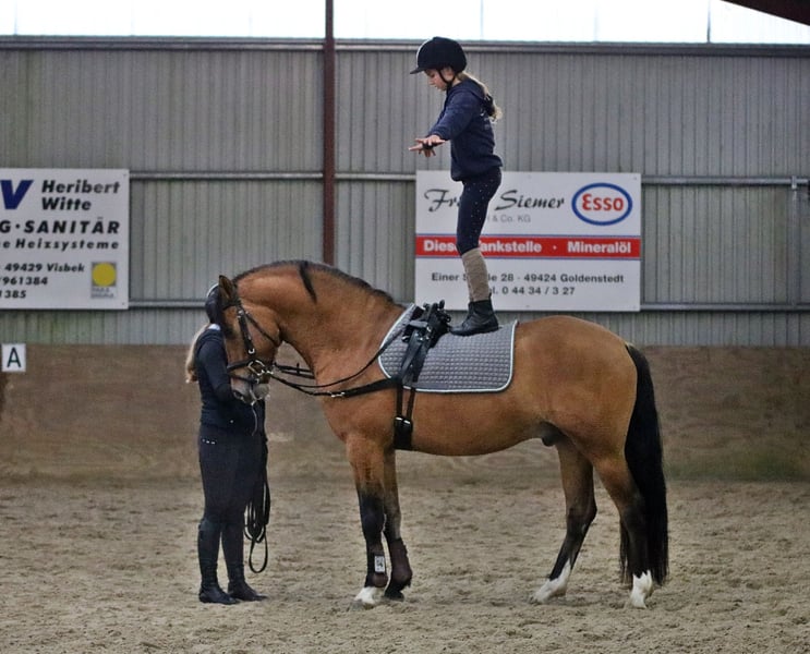 Zum Verkauf steht ein wunderschöner Reitpony-Wallach (Deutsche Abstammung väterlicherseits) , geboren im Jahr 2022. Das Pony ist ein eleganter Falbe mit einem Stockmaß von 148 cm. Es ist ideal für den Dressur- sowie Springsport geeignet und zeigt viel Talent sowie eine angenehme Charakter. Das Pony ist solid ausgebildet, freundlich im Umgang und besitzt eine vielversprechende Zukunft im Sport odder einfach als Freizeitpartner für die ganze Familie. Lucky-Luke ist kräftig gebaut mit außerordentlich viel Fundament. Großartige Grundgangarten, zeigt Talent am Sprung, arbeitswillig und vielseitig einsetzbar. Röntgenologisch unteruscht jedoch ohne Befund. Eine klinishce Ankaufsunterucheung wird zeitnah zur Übergabe durchgeführt. Bei Interesse oder weiteren Fragen stehen wir gerne zur Verfügung. Nur seriöse Anfragen, Besichtigungen Samstagvormittag nach telefonischer Vereinbarung möglich. Videos sind vorhanden. Wir bitten um Verständnis, dass Videos werden nur nach telefinischer Kontaktaufnahme per whatsapp verschickt.