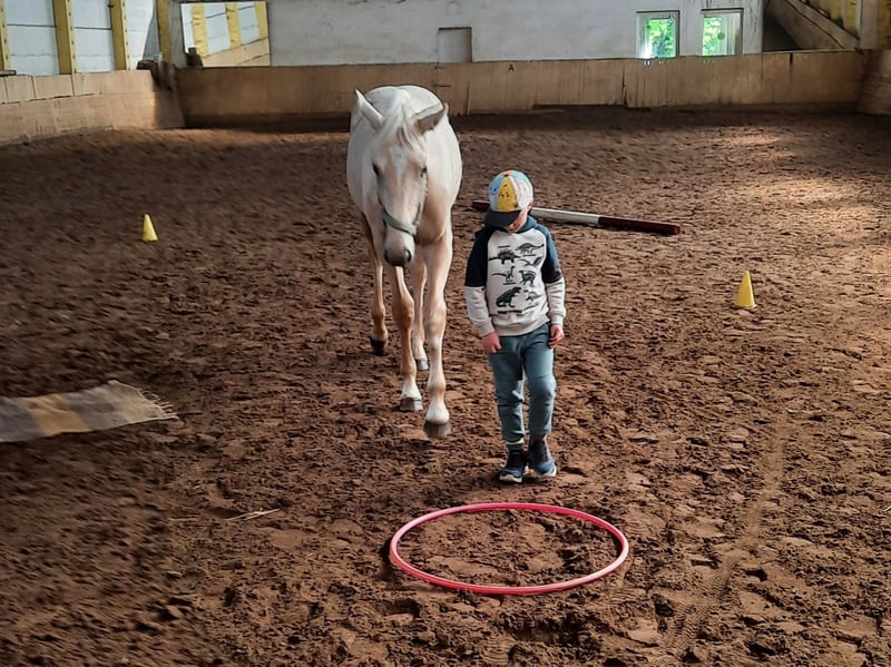 Bright Benicio (Spitzname "Brighty") ist ein unglaublich sympathischer Kerl mit korrektem Gebäude und sehr guten Grundgangarten, für die er zur DSP-Fohlenschau in Neustadt/Dosse 2024 mit einer Prämierung und der Championatsqualifikation belohnt wurde. (Zum Championat konnten wir aus organisatorischen Gründen nicht fahren.) Über Benicio-Blut bringt Brighty ausgezeichnete Dressur- und Rittigkeitsveranlagung mit. Die Sonderfarbe Palomino ist ein zusätzlicher Bonus, der ihn zu einem absoluten Hingucker macht. Vater Ben Benicio ist momentan auf Erfolgskurs und sammelt Siege und Platzierungen in Dressuren der Klasse S - inzwischen auch auf internationalem Niveau. Brighty ist halfterführig und kennt bereits Spaziergänge im Wald und spielerische Bodenarbeit mit Gymnastikball und Co. Er ist dabei sehr aufgeschlossen und artig.