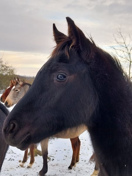 Nous vendons un très élégant poulain noir, fils du hongre Trakehner Ivanhoe (Élevage Hörem). D'une beauté typique incroyable et doté de très bonnes allures fondamentales, il est certainement intéressant pour les éleveurs de hongres. Nos juments d'élevage se distinguent toutes par un caractère très amical et désireux d'apprendre, ce qui nous permet d'attendre la même chose de leur descendance. La taille finale attendue est d'environ 170 cm. Il grandit dans un troupeau mixte avec deux autres poulains. Nos chevaux passent l'été dans de grands pâturages et, même en hiver, ils vivent à l'extérieur dans un abri ouvert avec un enclos d'environ 1 hectare. Une prise en charge serait possible, si souhaité. Nous élevons des chevaux de selle depuis 15 ans et avons ainsi une longue expérience en matière d'élevage et de soins. Une rencontre est possible à tout moment sur rendez-vous. Au printemps 2026, nous aurons également un fils de Freiherr von Stein, âgé de 3 ans, à vendre. Celui-ci est actuellement en élevage avec un autre hongre. Si vous êtes intéressé, je peux vous fournir plus d'informations.