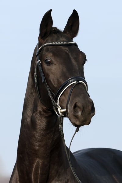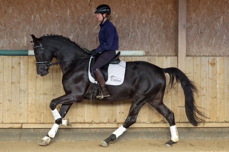 For sale is the exceptional DSP stallion V-Mann, a noble black gelding without markings who impresses not only with his elegant appearance but, above all, with his quality. He completed his 50-day test with outstanding scores, including an 8.0 in walk, a 9.0 for willingness to perform, and no score below 7.5. V-Mann consistently demonstrates high performance potential, possesses excellent basic gaits, and has a clear, uncomplicated temperament. He is both transport- and farrier-safe. His pedigree further enhances his appeal: Vivanero x Pashma (El Mariachi ox) from the renowned Neustädter P-family, around Poetin II – a combination of noble bloodlines and proven dressage performance, making him a very promising candidate for the big arena. Standing approximately 170 cm tall and with his modern, expressive presence, this stallion offers ideal prerequisites for a successful sporting career.